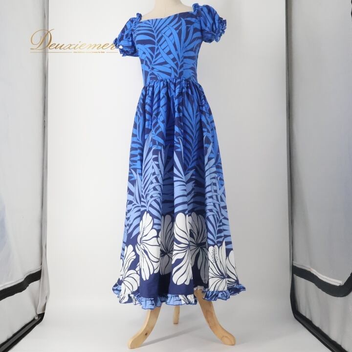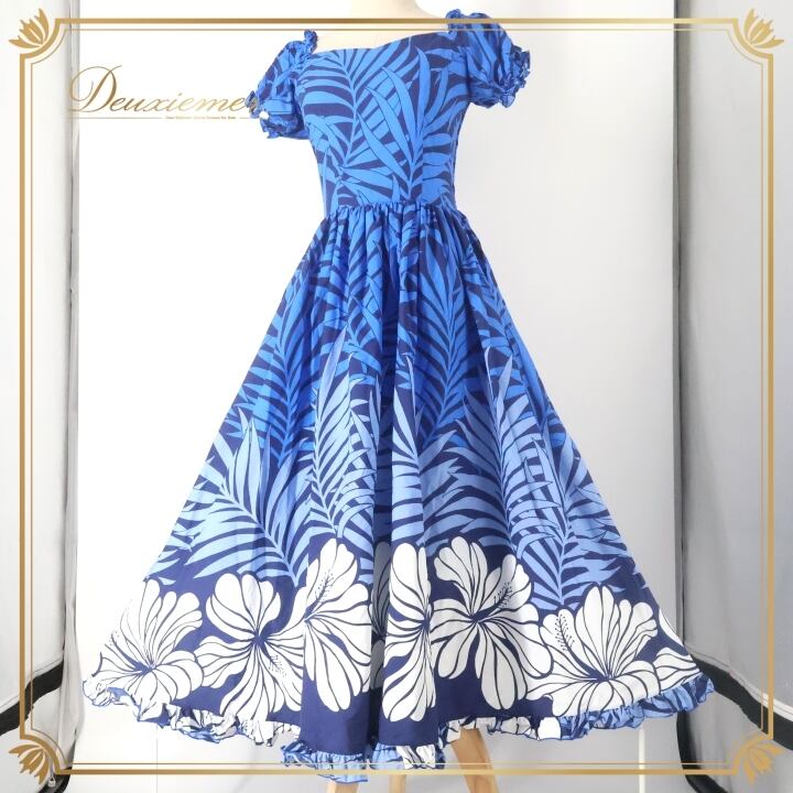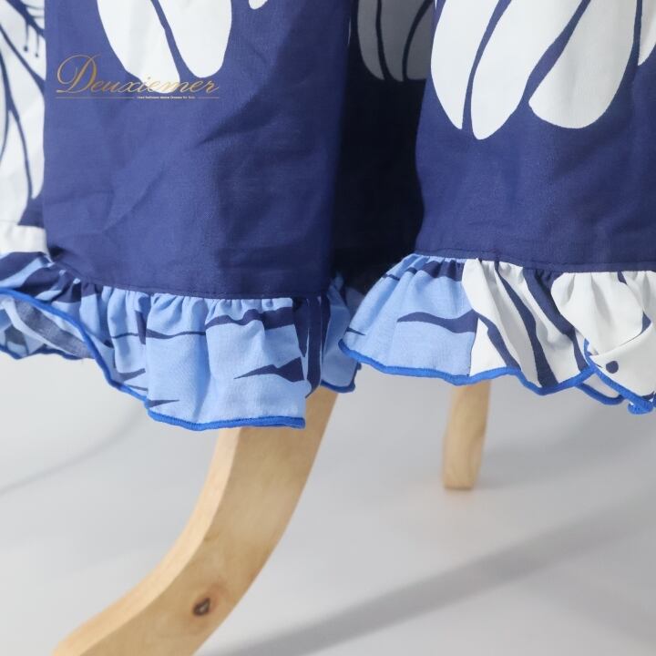 フラダンス 衣装 ワンピース ドレス ブルー系 ハワイアンプリント アロハ フラ ダンス レッスン 練習 フリル かわいい おしゃれ 華やか 鮮やか 上品 大人っぽい 植物柄 花柄 ホワイト系 ネイビー系 青 白 紺 カジュアル 夏用 きれいめ