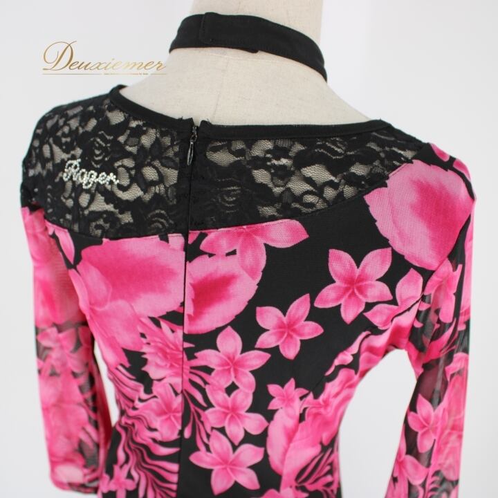 社交ダンス 衣装 スタンダード ドレス ワンピース パーティドレス Roger 黒 ピンク系 ブラック系 花柄 レース チョーカー 派手 ラインストーン 大人用 ふんわりスカート ショー衣装 メンズウェアとコーデ おしゃれ ストレッチ カジュアル おすすめ パフォーマンス 高品質 イベント用 ビッグフラワー デザイン重視 体型カバー パーティー用