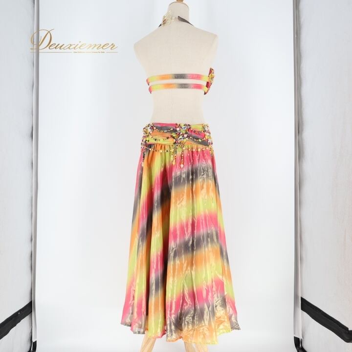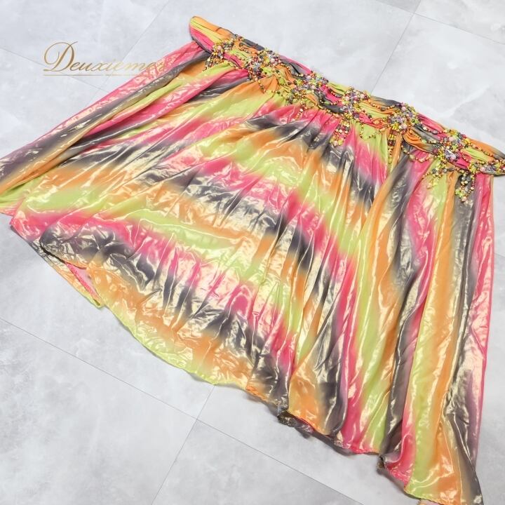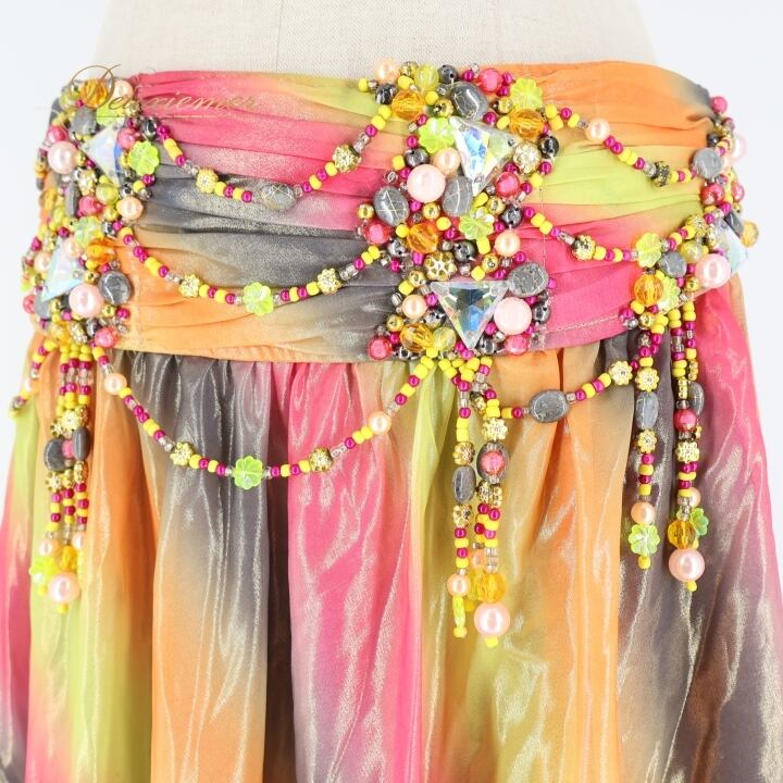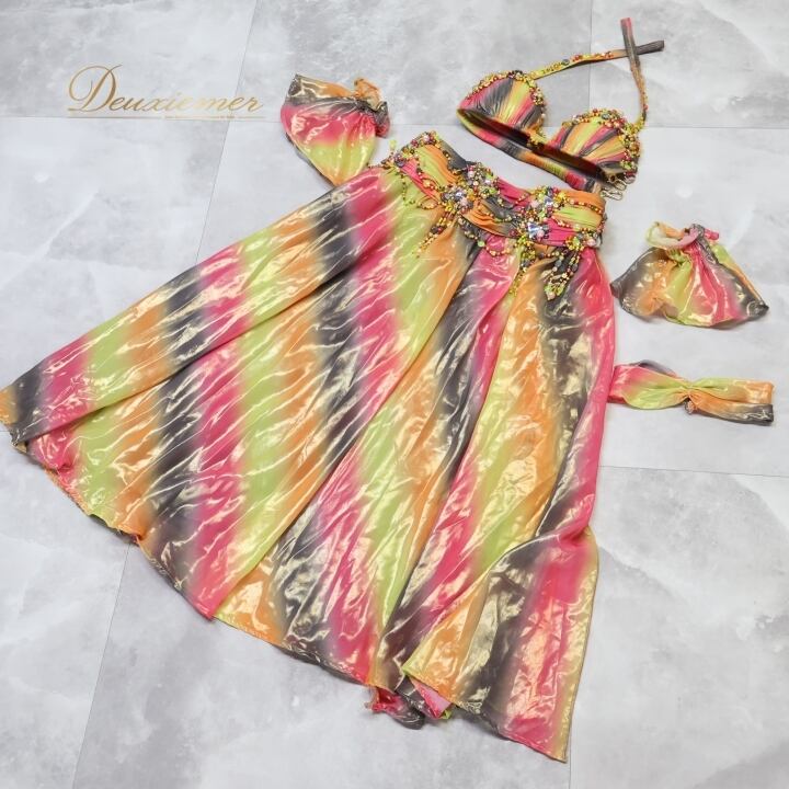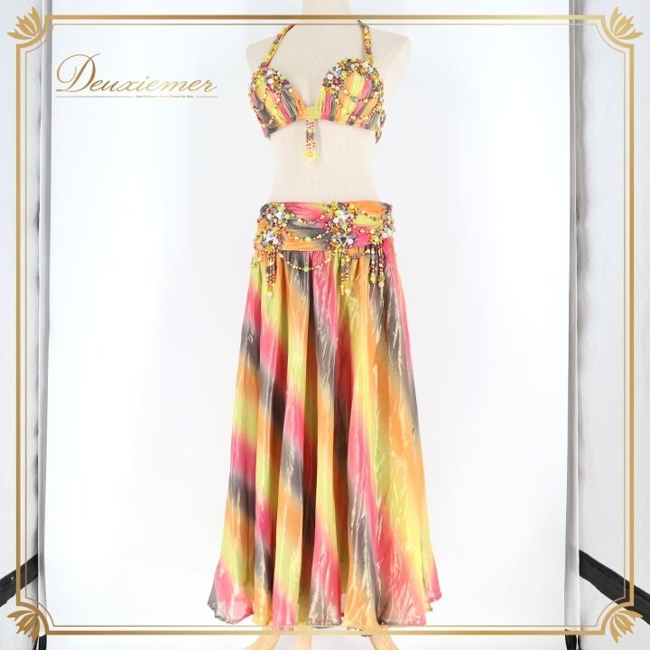 ベリーダンス オリエンタル 衣装 上下セット ピンク系 トップス スカート アーム飾り 腕飾り カラフル 黄緑 光沢 かわいい ダンス衣装 ステージ イベント 華やか ビーズ ラインストーン 豪華 装飾 オレンジ系 グレイ系 グリーン系