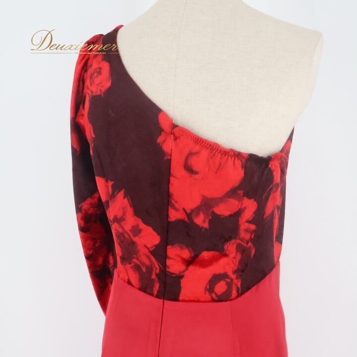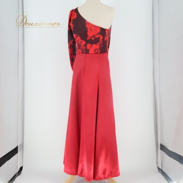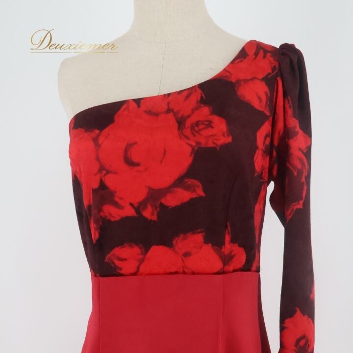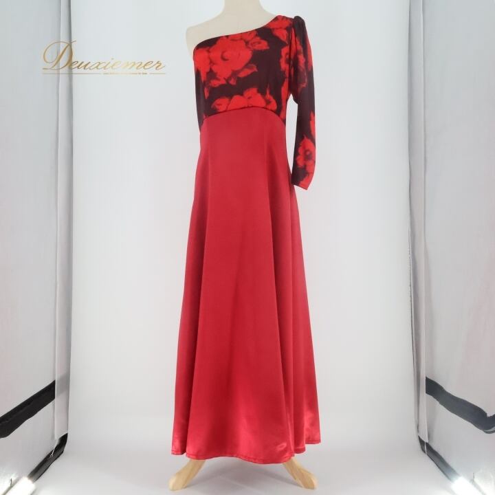 フラダンス 衣装 ワンピース ドレス レッド系 アロハスタンダード 日本製 バラ柄 花柄 ALOHA STANDARDS ワンショルダー 長袖 光沢 高級感 華やか 鮮やか 大人っぽい 上品 ハワイアン アロハ フラ ダンス レッスン 練習 ブラック系 黒 赤 大人用 フェミニン カジュアル エレガント おしゃれ 軽い ダンス衣装 フラ衣装 ワンピースドレス サテン ロング フレア スリム エレガントスタイル ステージ衣装 高級感