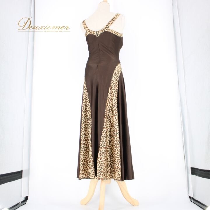 社交ダンス 衣装 スタンダード ドレス ワンピース レッスンウェア パーティドレス オールシーズン ブラウン系 ベージュ系 ヒョウ柄 茶色 派手 Mサイズ 伸縮性あり 外出用 舞台衣装 フォーマル シック おしゃれ スリム フレア シングル パーティー ダンスウェア 競技用 エレガント スタイリッシュ お洒落 コスチューム