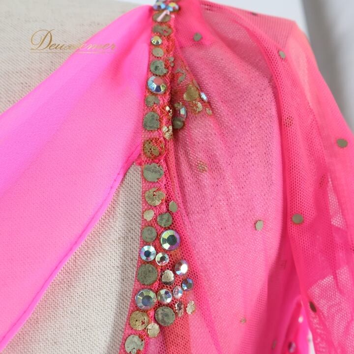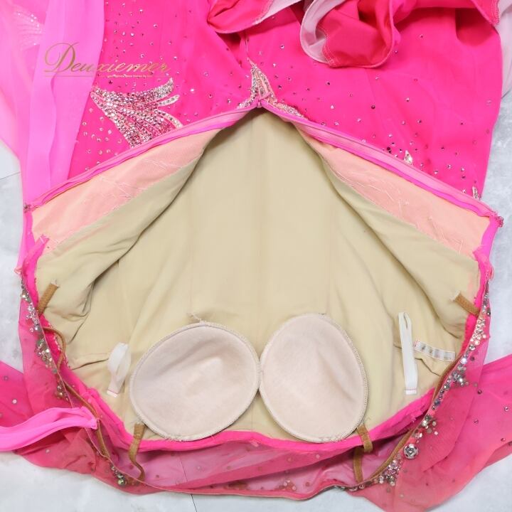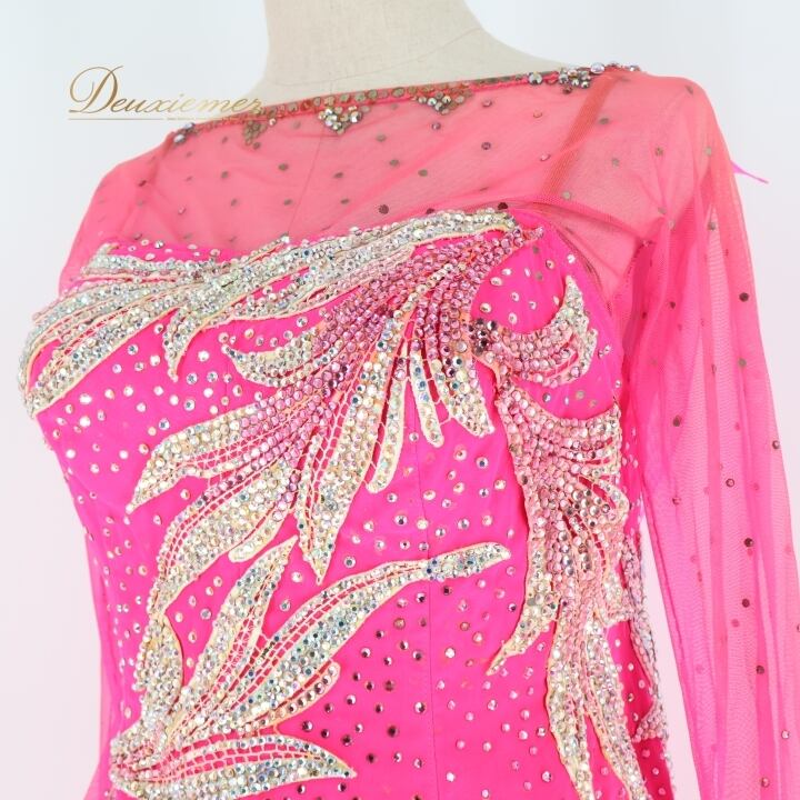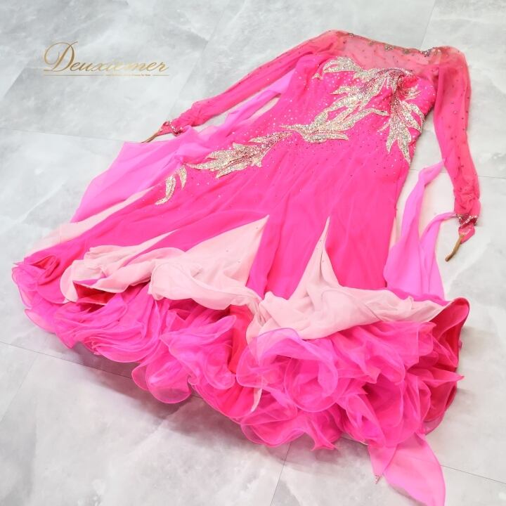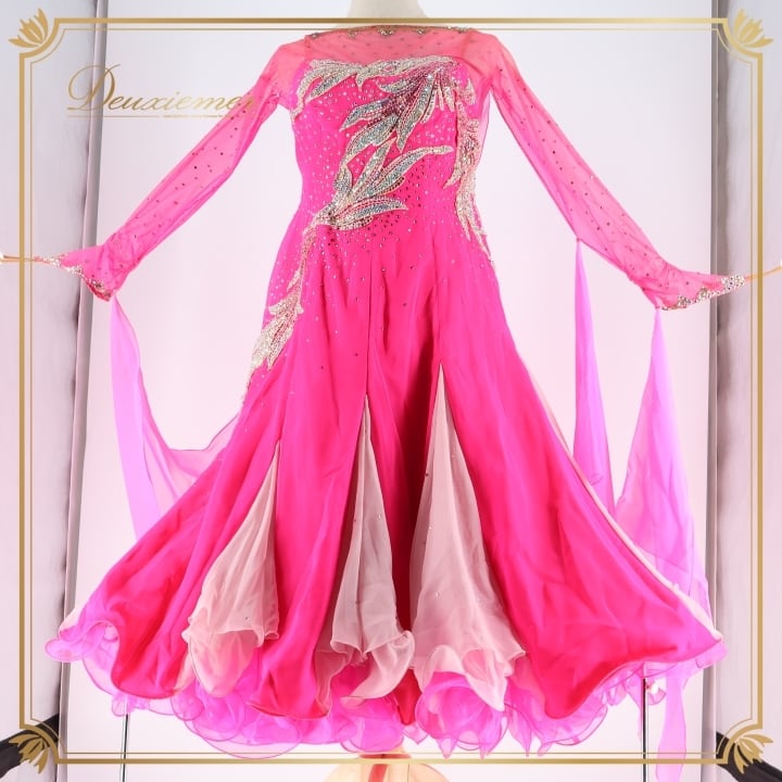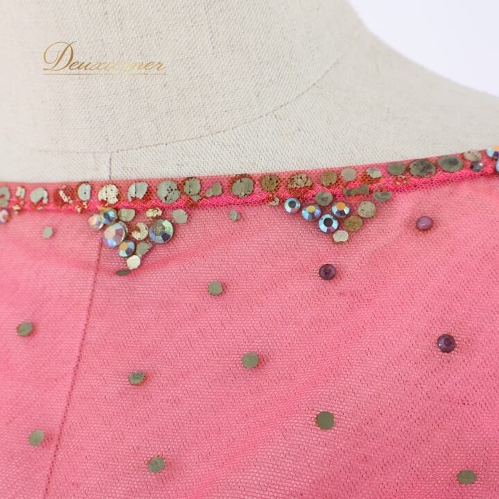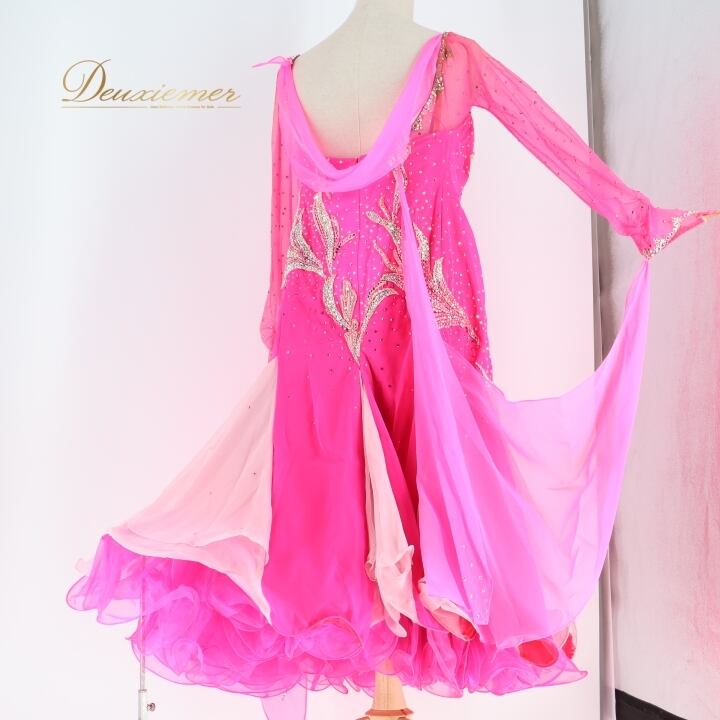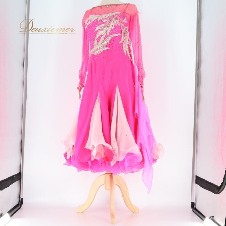 #社交ダンス #ダンス衣装 #ワンピース #ドレス #フリル #ピンク #スカート #かわいいデザイン #華やか #女性用トルソー #ダンススタイル #パーティー服 #特別な日 #演出衣装 #ファッション #スウィングダンス #社交ダンスドレス #オシャレ #カスタムメイド #ENUTSU