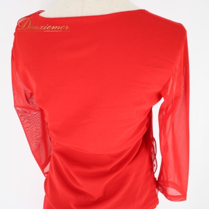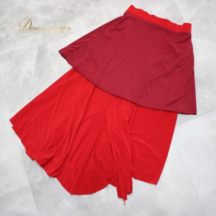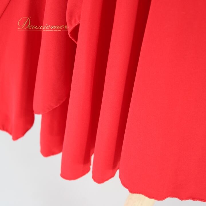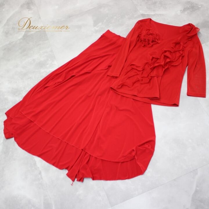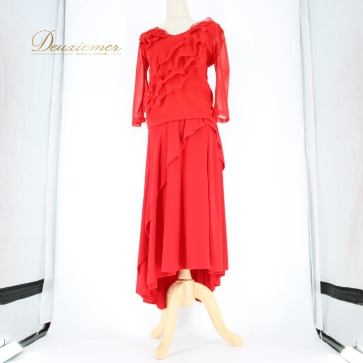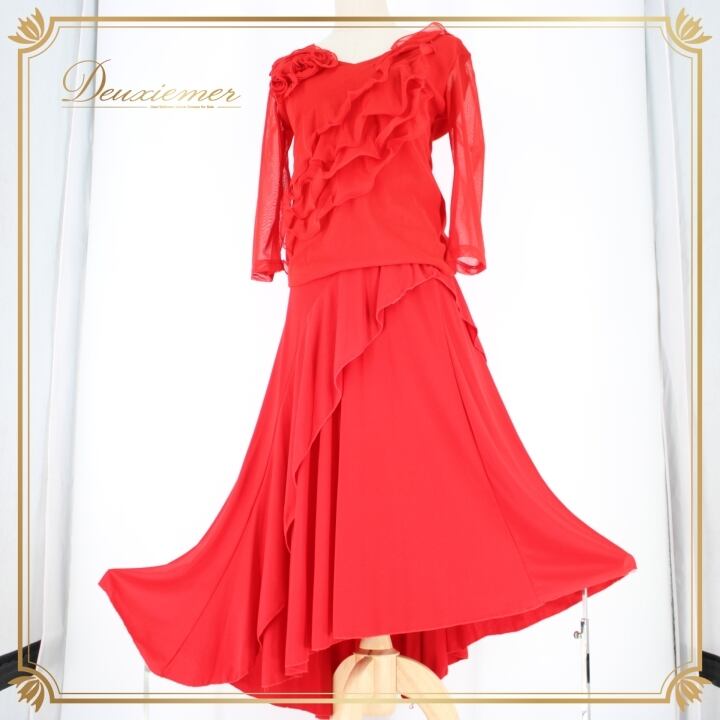 #社交ダンス #ダンス衣装 #ダンスファッション #ステージ衣装 #レッドドレス #パフォーマンス衣装 #女性用衣装 #おしゃれ #ダンススタイル #ダンスウェア #カスタム衣装 #オリジナルデザイン #花飾り #トルソー展示 #全身コーデ #ストレッチ素材 #ウエストゴム #燃えるような赤 #ダンスクチュール #ENUTSU