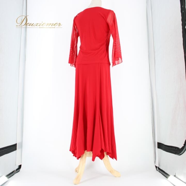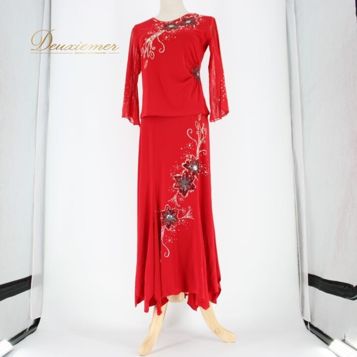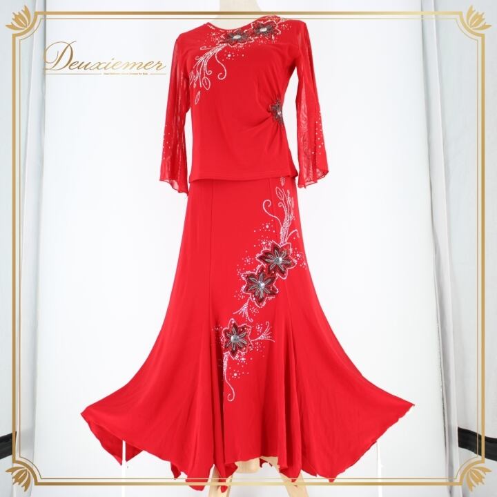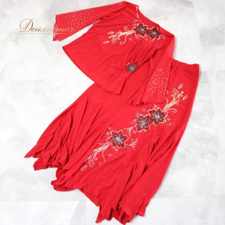 社交ダンス 衣装 スタンダード 上下セット ツーピース レッスンウェア パーティ衣装 ACROSS 赤 レッド系 ラインストーン スパンコール 花柄 講座 発表会 衣装専門店 踊りやすい おしゃれ 目立つ おすすめ レディース 厚手 丈夫 職人 技術 イベント向け 体型カバー ストレッチ 風合い良い かっこいい パーティー用 ダンスウェア 競技用 フォーマル ショートトス スリーブ付き