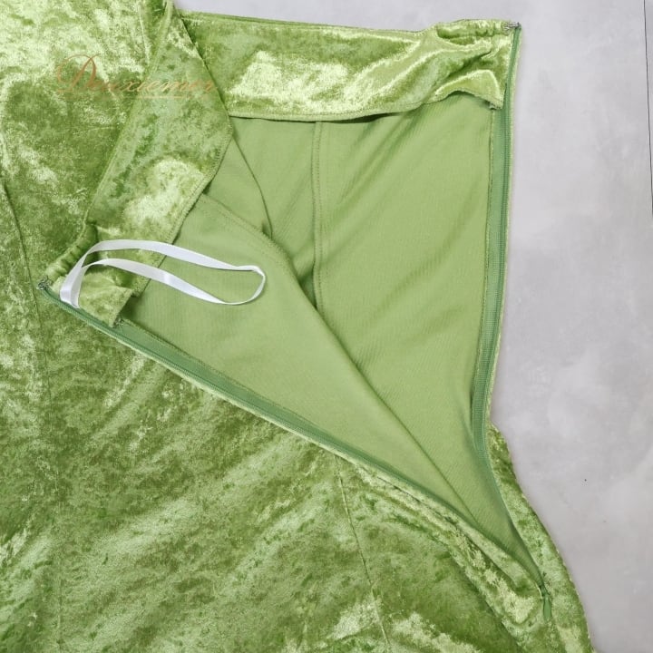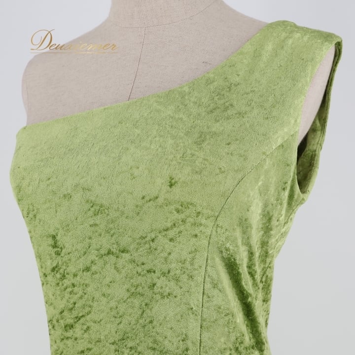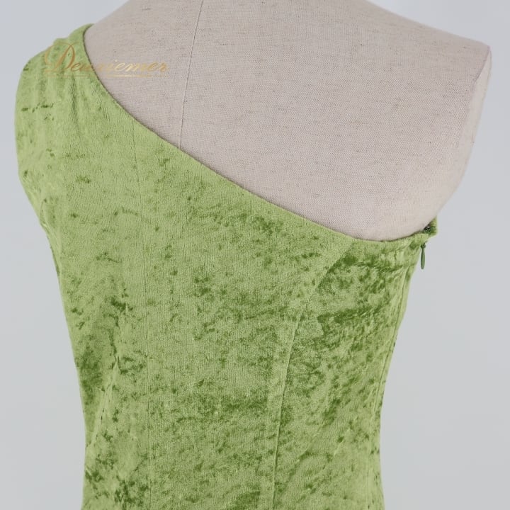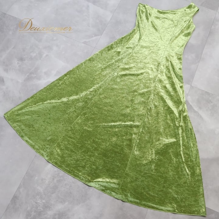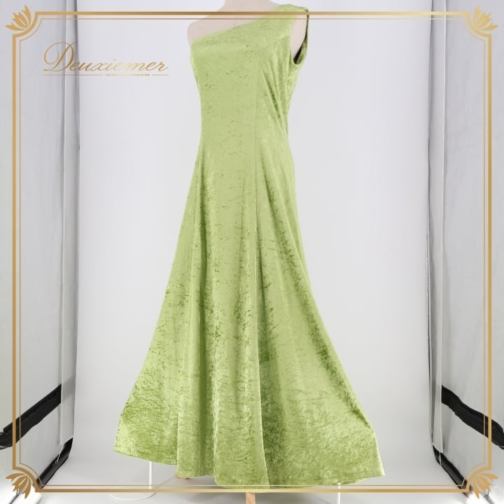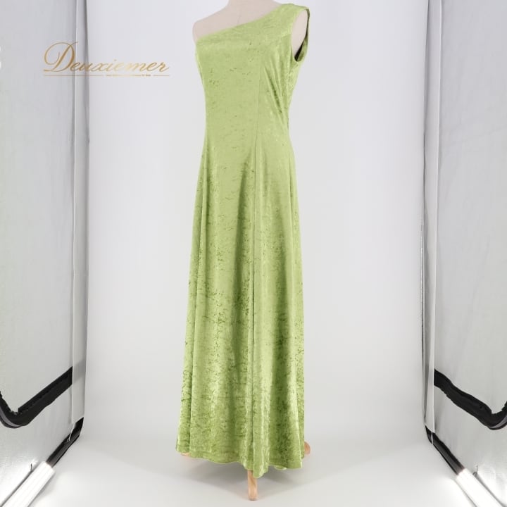 フラダンス 衣装 ワンピース ドレス PINTUCK グリーン系 ベロア ワンショルダー 無地 シンプル 上品 きれい 華やか 鮮やか 高級感 光沢感 かわいい 明るい 黄緑 ハワイアン アロハ フラ ダンス レッスン 練習 パーティー おしゃれ イベント衣装