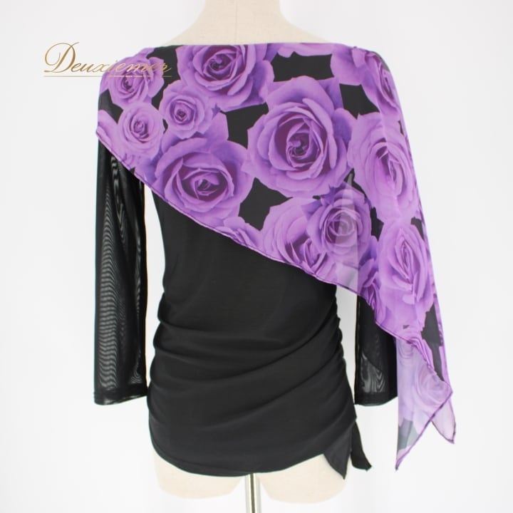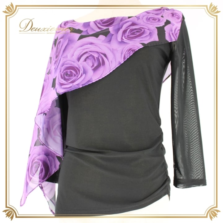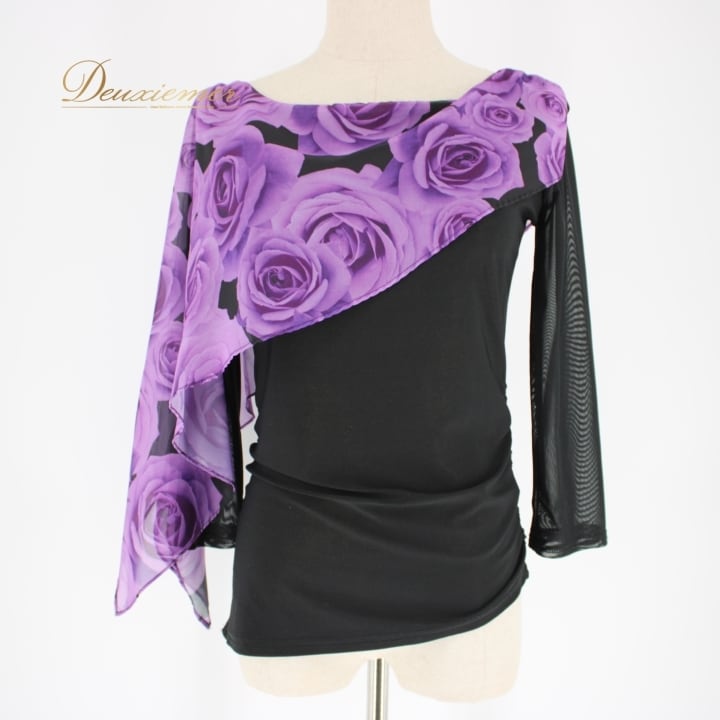 社交ダンス 衣装 スタンダード トップス レッスンウェア 紫 黒 ブラック系 パープル系 Leirena レイリーナ 長袖 花柄 薔薇 バラ 練習着 ショート丈 体型カバー おしゃれ ダンスウェア フェミニン リハーサル 練習用 伸縮性 軽量 かわいい 大人向け 女性用 デザイン性 使いやすい シック エレガント