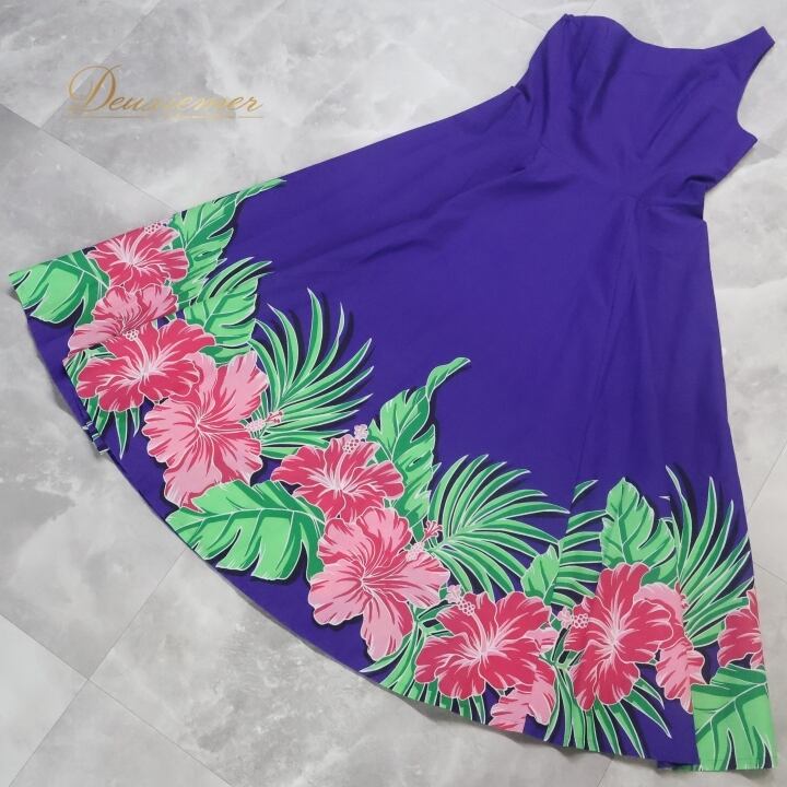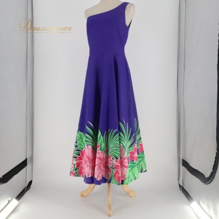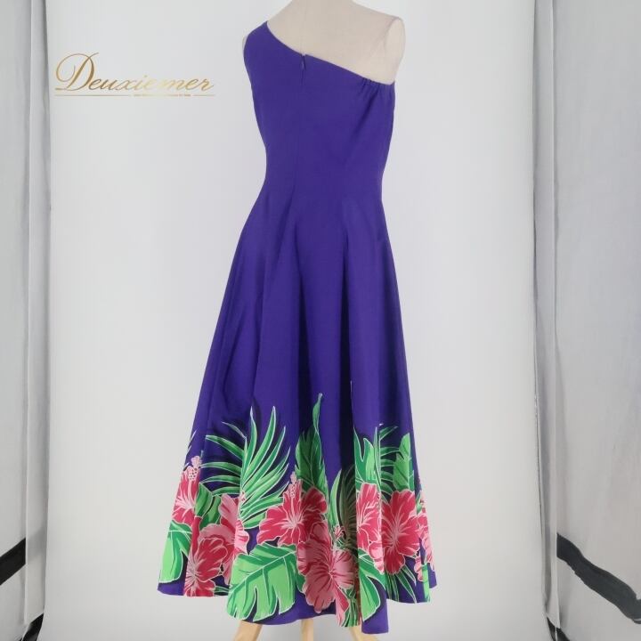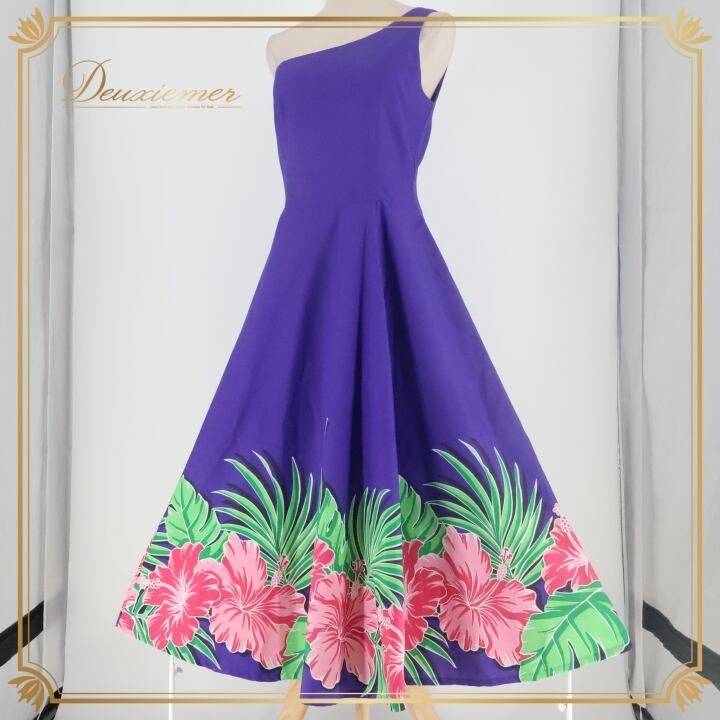 フラダンス 衣装 ワンピース ドレス Hula Ku パープル系 日本製 ワンショルダー ハイビスカス柄 シンプル かわいい 華やか 鮮やか 大人っぽい 上品 紫 ピンク ハワイアン アロハ ハワイアンプリント フラ ダンス レッスン 練習 おしゃれ セクシー