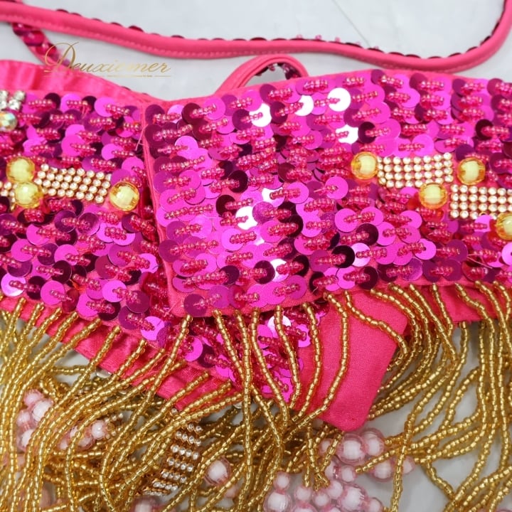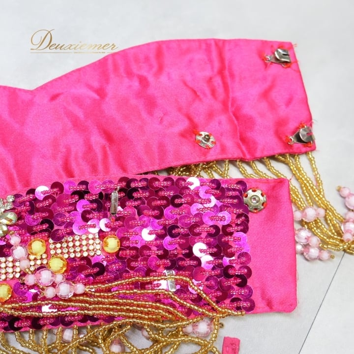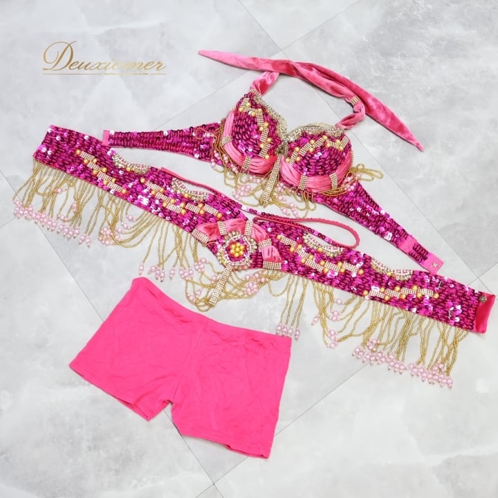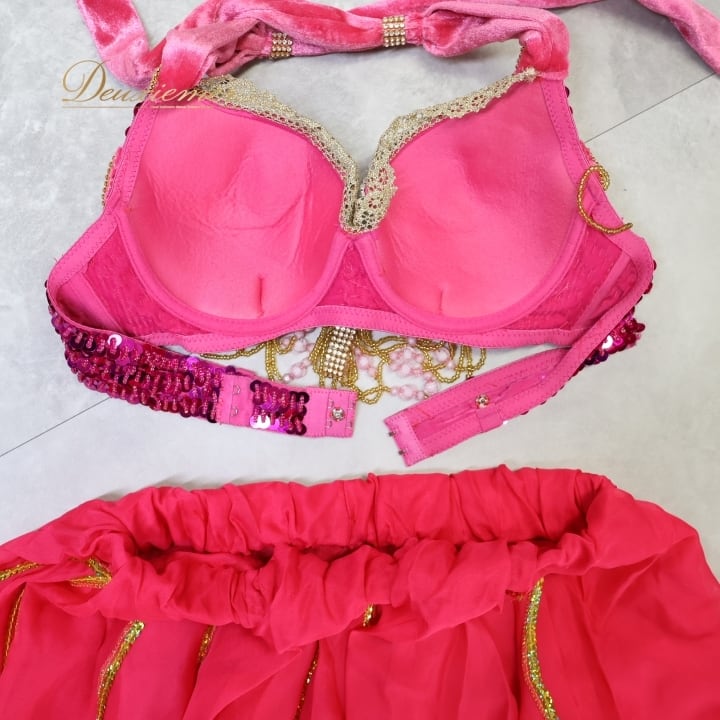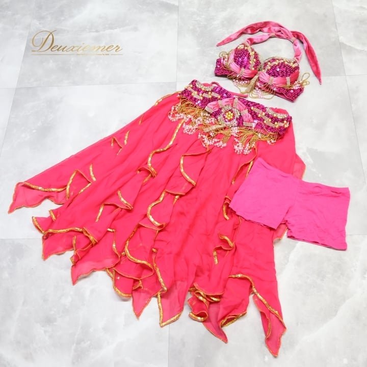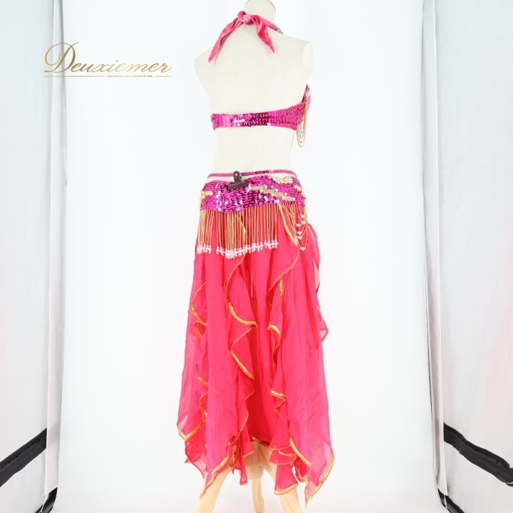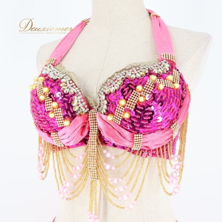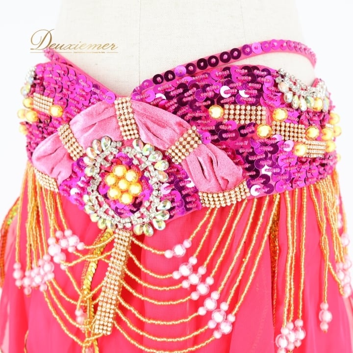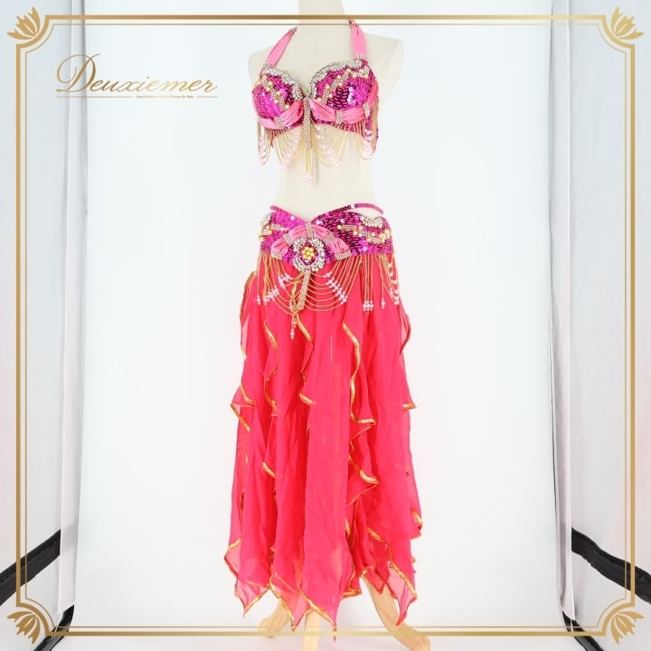 #ベリーダンス #オリエンタル衣装 #ダンス衣装 #ピンク #スパンコール #ビーズ装飾 #透け感 #スカート #トップス #ホック #ボタン #ファッション #コスチューム #女性用 #ダンスパフォーマンス #アンダーストラップ #ウエストゴム #豪華なデザイン #トルソー #ENUTSU