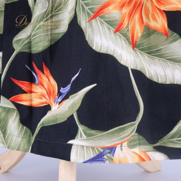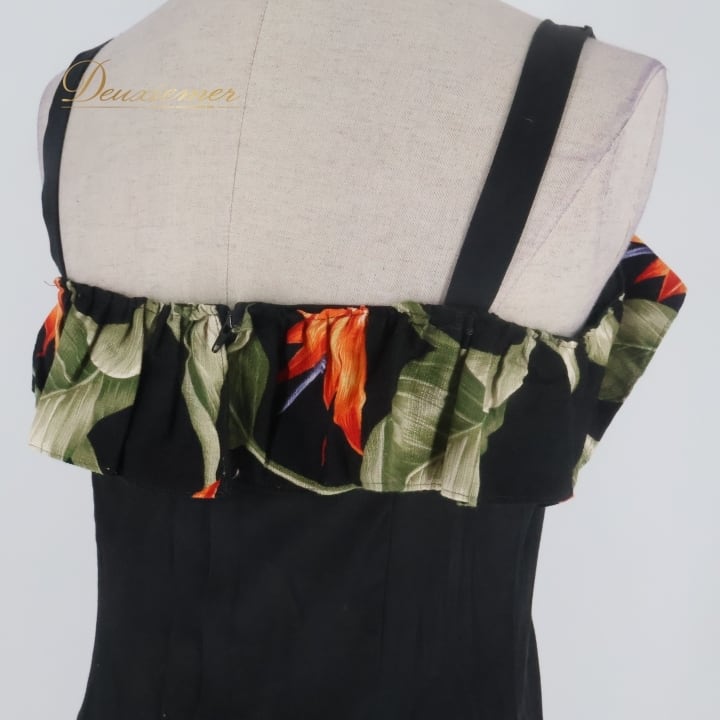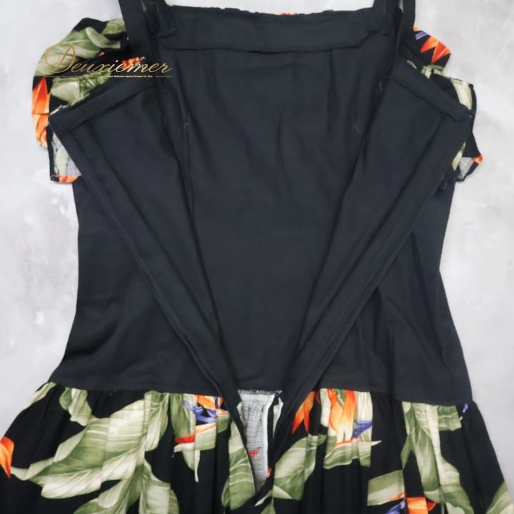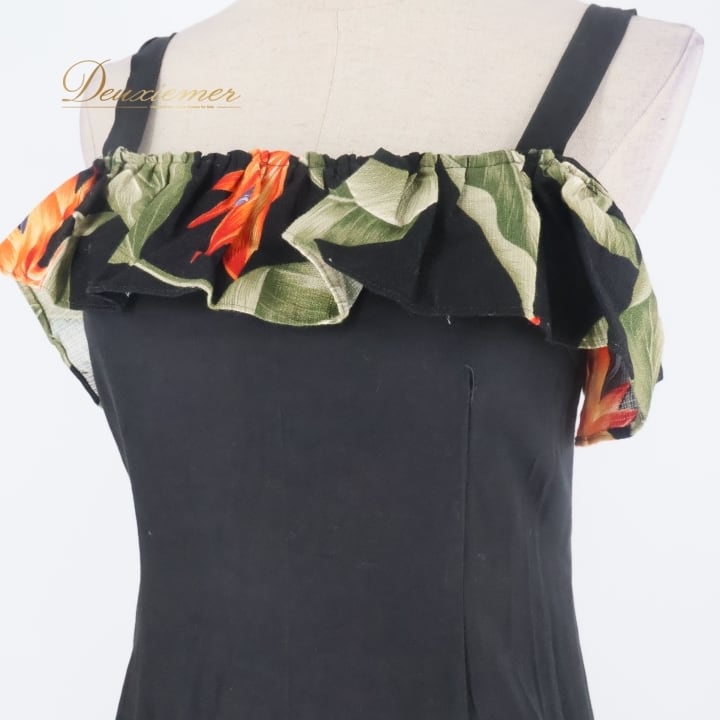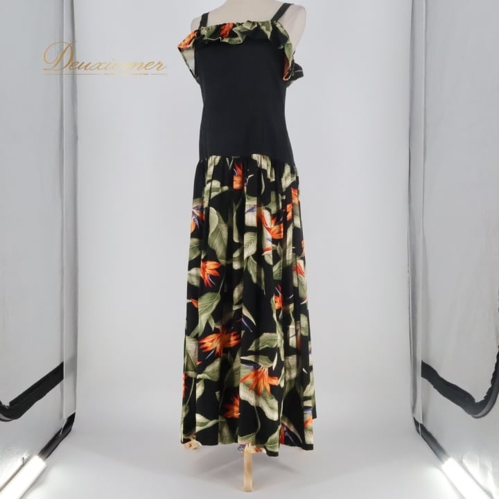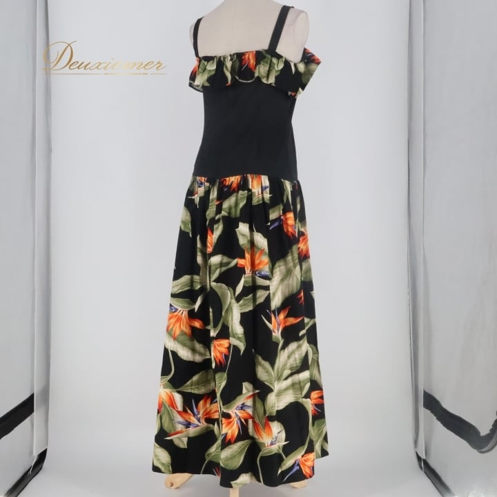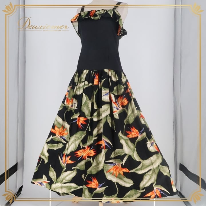 フラダンス 衣装 ワンピース ドレス ブラック系 キャミソールワンピース バードオブパラダイス柄 フリル かわいい 華やか 鮮やか 大人っぽい 黒 橙 緑 ハワイアン アロハ ハワイアンプリント フラ ダンス レッスン 練習 レディース おしゃれ