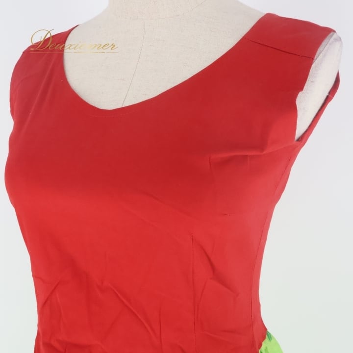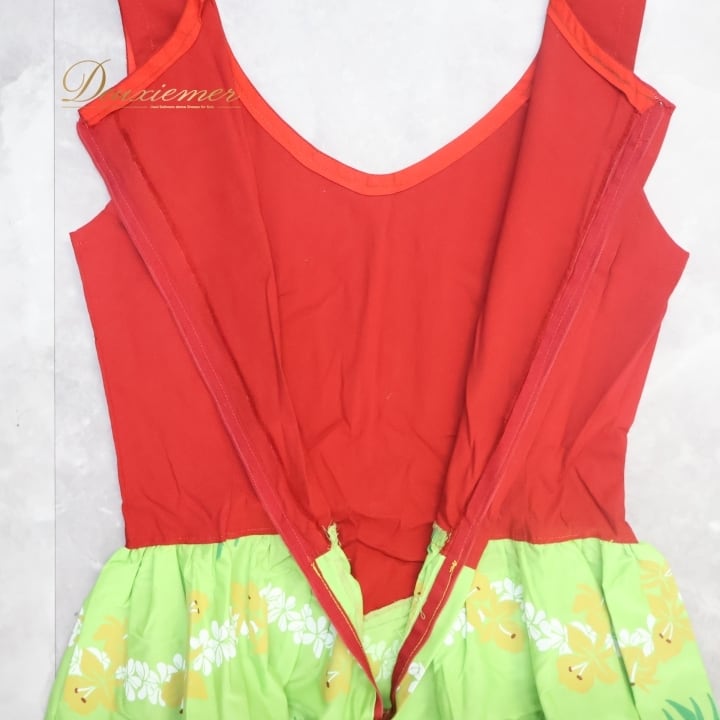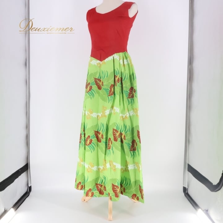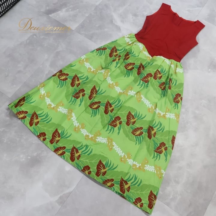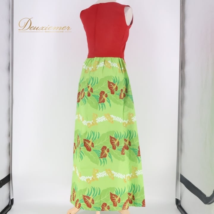 フラダンス 衣装 ワンピース ドレス レッド系 グリーン系 ノースリーブ レイ柄 花柄 葉っぱ柄 かわいい 鮮やか 華やか 明るい カラフル 赤 緑 ハワイアン アロハ ハワイアンプリント フラ ダンス レッスン 練習 カジュアル おしゃれ パーティー