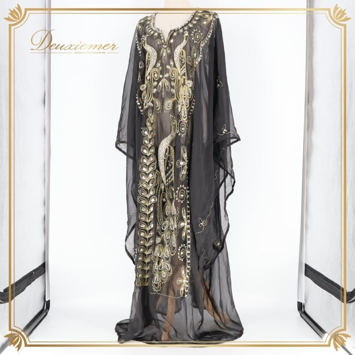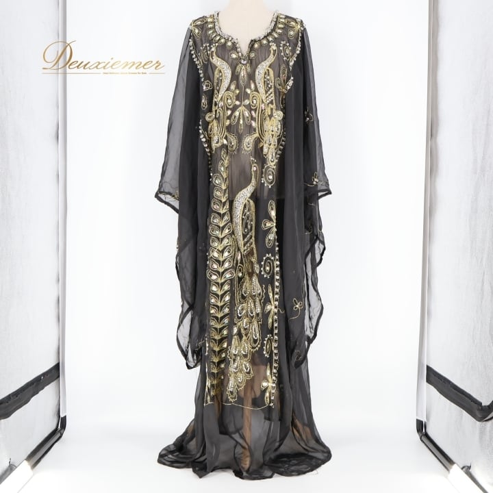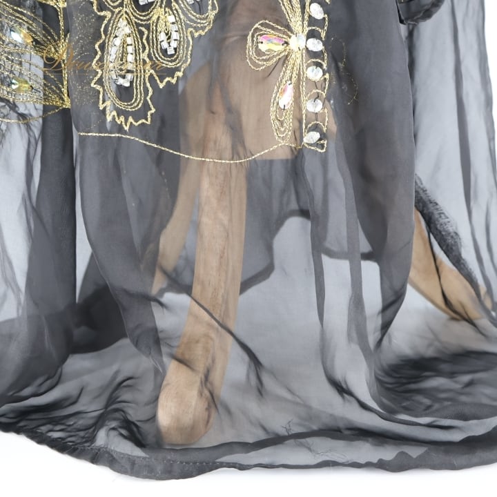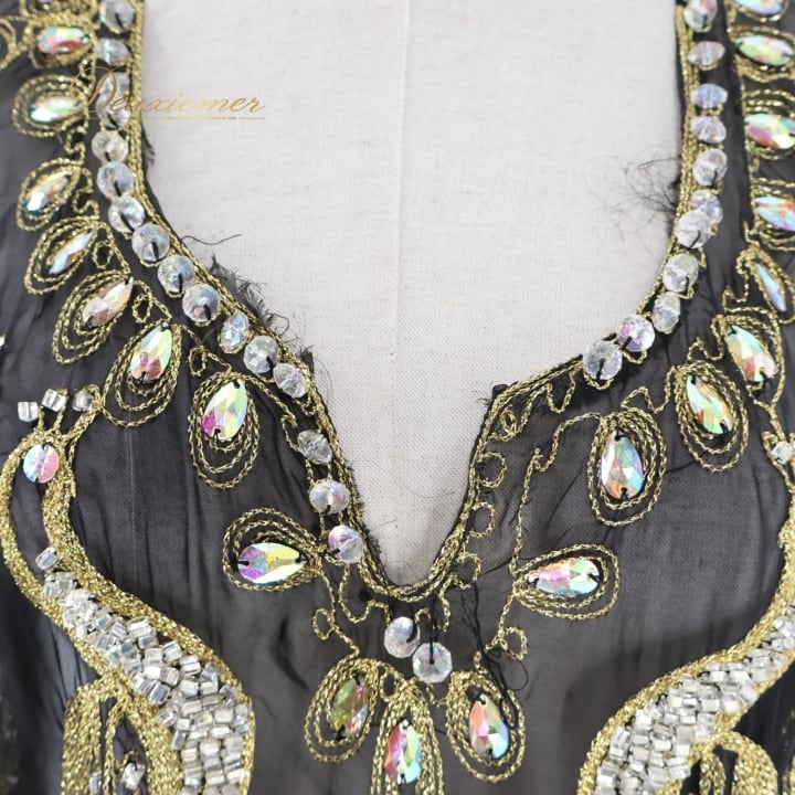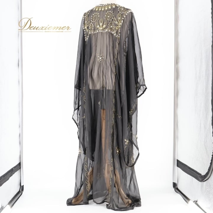 ベリーダンス 衣装 ハリージドレス ブラック系 ラインストーン 黒 金 ワンピース ドレス 羽織り 透け感 ガラベーヤ 豪華 装飾 民族舞踏 刺繍 ステージ 華やか イベント かっこいい シック ゴールド系