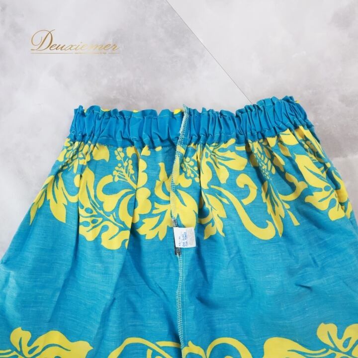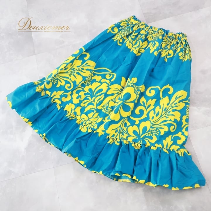 フラダンス 衣装 パウスカート ブルー系 ハイビスカス柄 ハワイアンプリント アロハ フラ ダンス レッスン 練習 フリル イエロー系 水色 黄 華やか 鮮やか かわいい おしゃれ シングル スカート さわやか 花柄 植物柄 フラスカート ダンス衣装 ハイビスカス