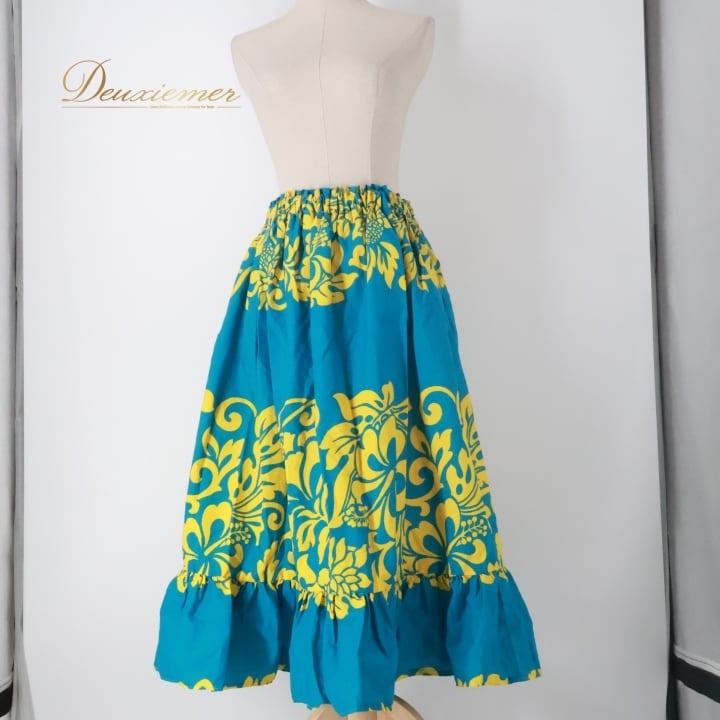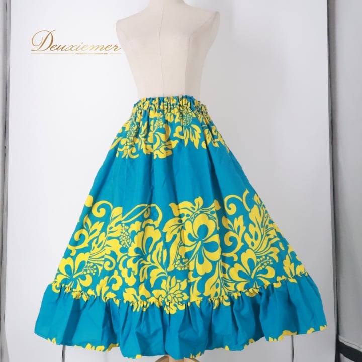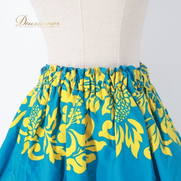 #フラダンス #フラダンス衣装 #パウスカート #ハイビスカス柄 #ブルーイエロー #ウエストゴム #ダンス衣装 #アロハ #ハワイアンフラ #ビーチファッション #カジュアルスタイル #女性用衣装 #トルソー展示 #ハワイ文化 #リゾートスタイル #夏コーデ #トレンドファッション #ダンスレッスン #フラガール #ENUTSU