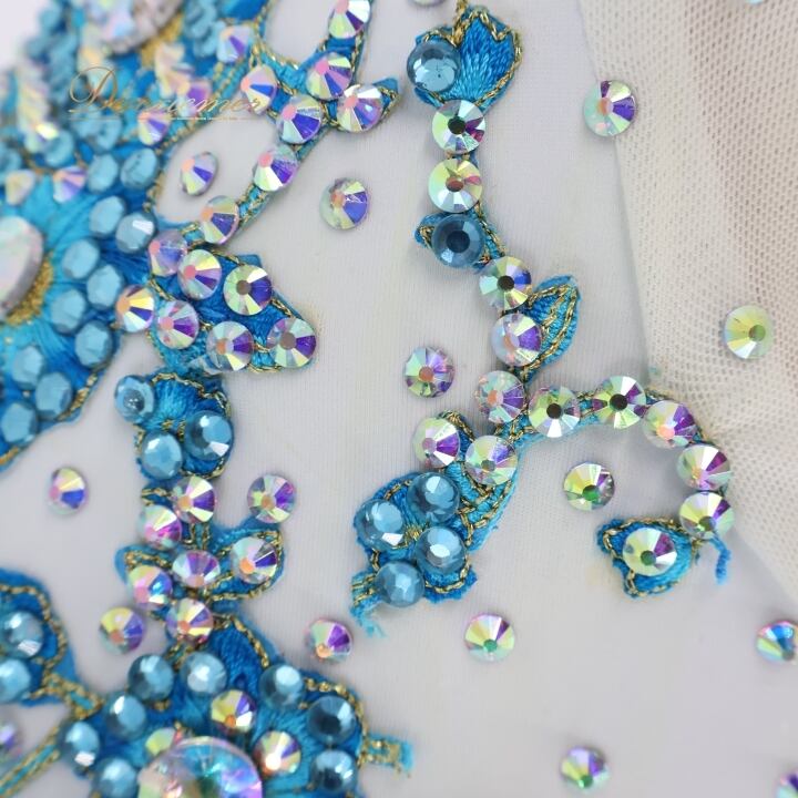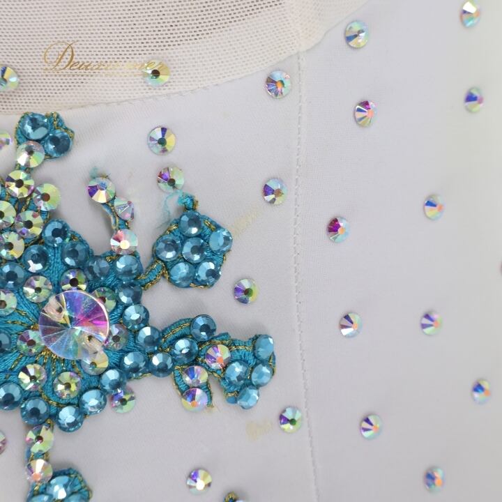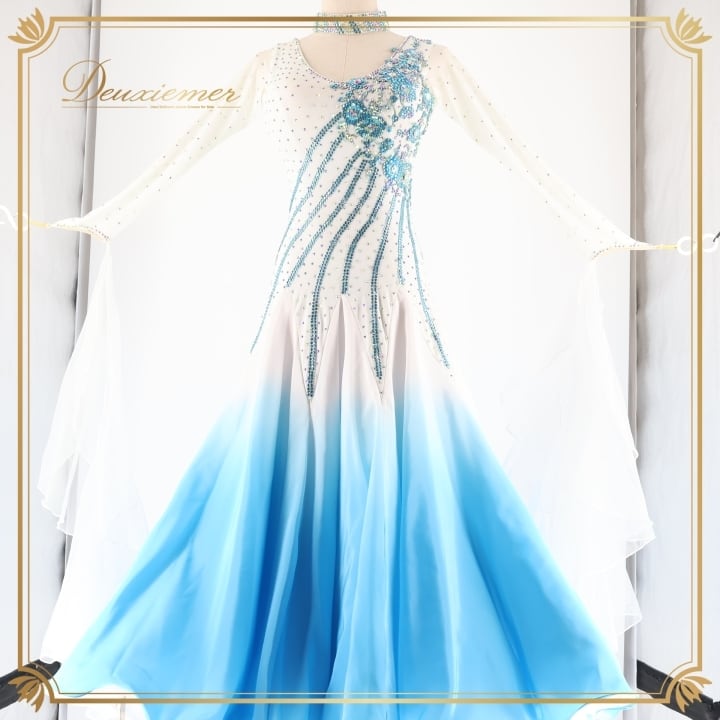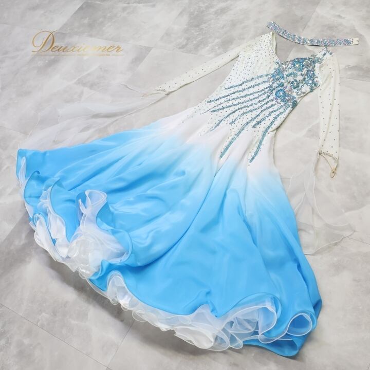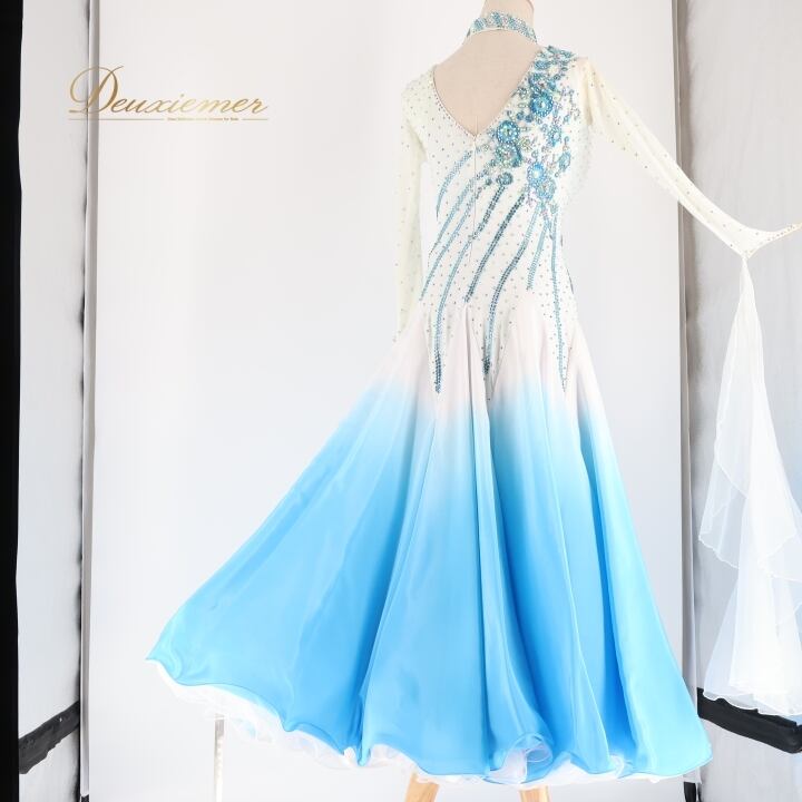 社交ダンス 衣装 スタンダードドレス ワンピース ドレス スタンダード 白 水色 フロート レース デモ 競技 ダンス パーティ 発表会 ホワイト系 ブルー系 グラデーション デザイン さわやか スカート 重ね着 エレガント イベント用 ファッション 美しい ステージ衣装 おしゃれ 競技会用