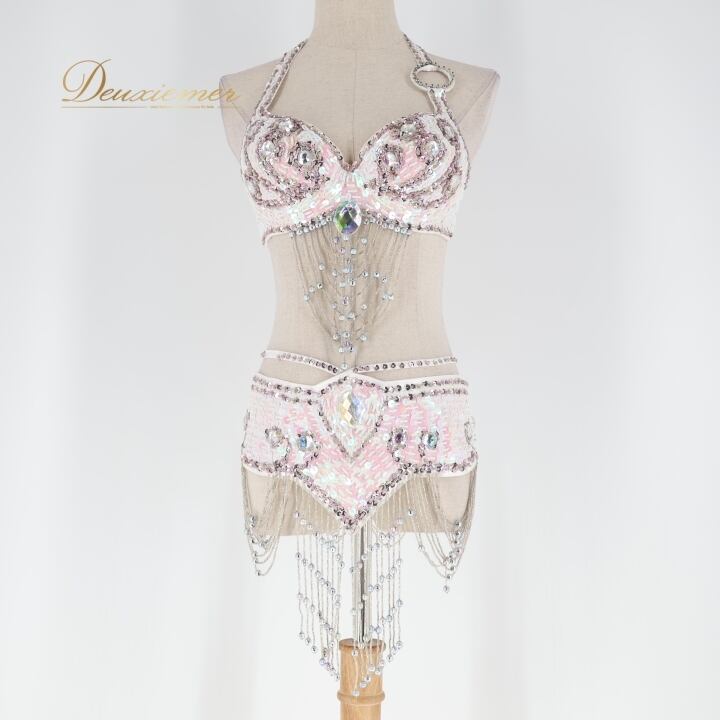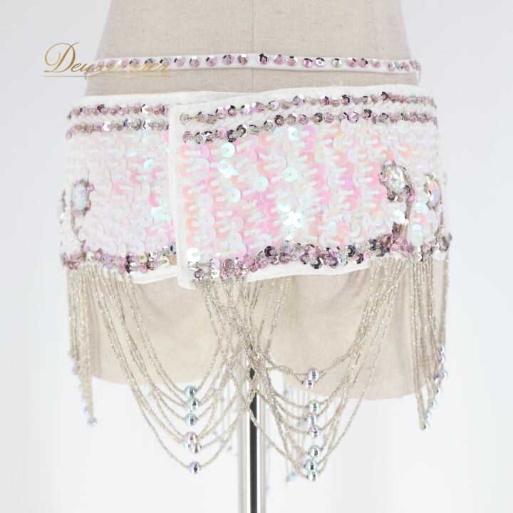 ベリーダンス オリエンタル 衣装 ホワイト系 トップス ベルト セット ピンク系 スパンコール ラインストーン ビーズ フリンジ かわいい 明るい ダンス衣装 ステージ イベント キラキラ 豪華 装飾