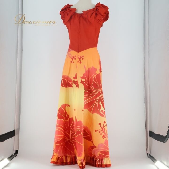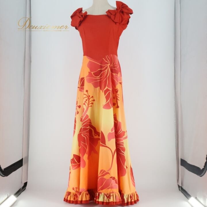フラダンス 衣装 ワンピース ドレス レッド系 アロハスタンダード 日本製 ハイビスカス柄 ALOHA STANDARDS 花柄 フリル リボン 華やか 鮮やか かわいい おしゃれ ハワイアン アロハ フラ ダンス レッスン 練習 オレンジ系 赤 橙 イエロー系 黄 グラデーション フラダンス衣装 ロング丈 夏用 かわいいデザイン 色鮮やか ハワイ ファッション エレガント リゾート ノースリーブ