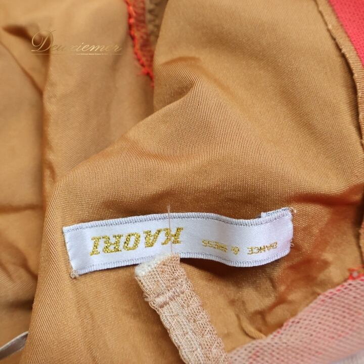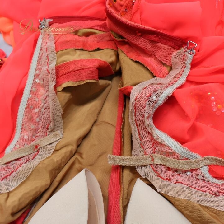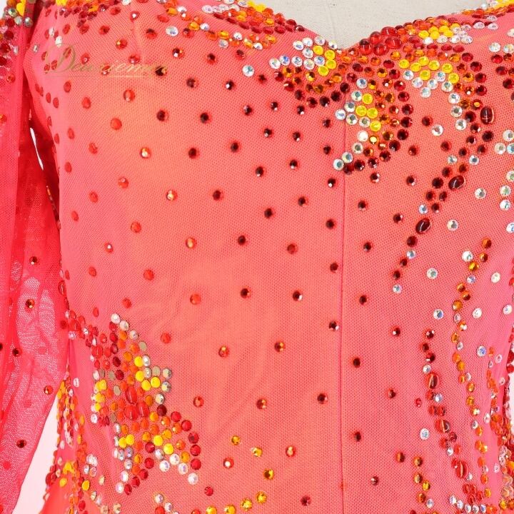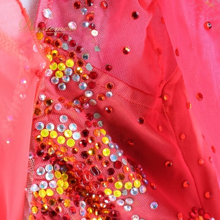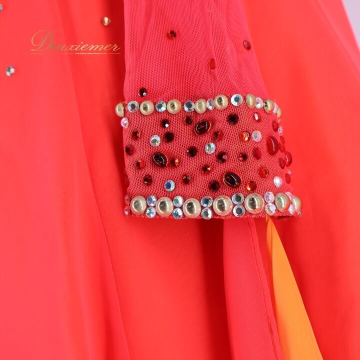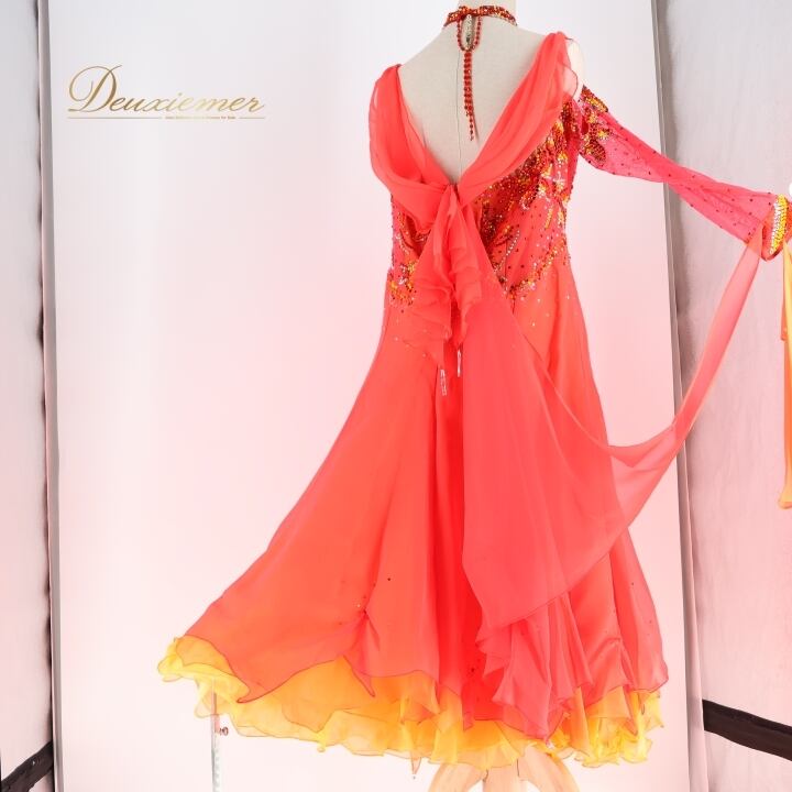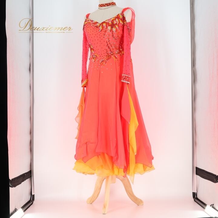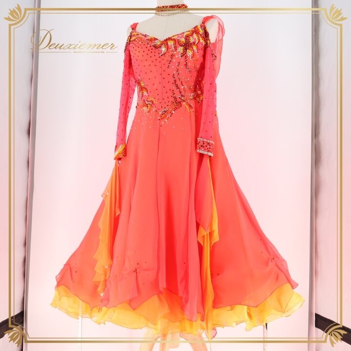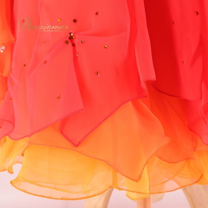 社交ダンス 衣装 スタンダードドレス 朱色 KAORI カオリ デモ 競技 ダンス パーティ 発表会 フリル レース 黄色 大きめ レッド系 オレンジ系 ダンス衣装 フォーマルドレス 舞台衣装 輝き おしゃれ 大人用 女性用 競技用