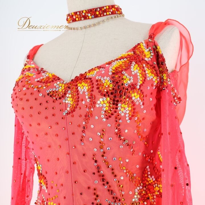 #社交ダンス #ダンス衣装 #ワンピース #ドレス #レオタード #背面ファスナー #朱色 #鮮やかな色 #ダンスファッション #女性用トルソー #伸縮性 #胸パッド #大きめサイズ #フィット感 #ダンスパフォーマンス #エレガント #スタイル #衣装選び #シーズンファッション #KAORI #ENUTSU