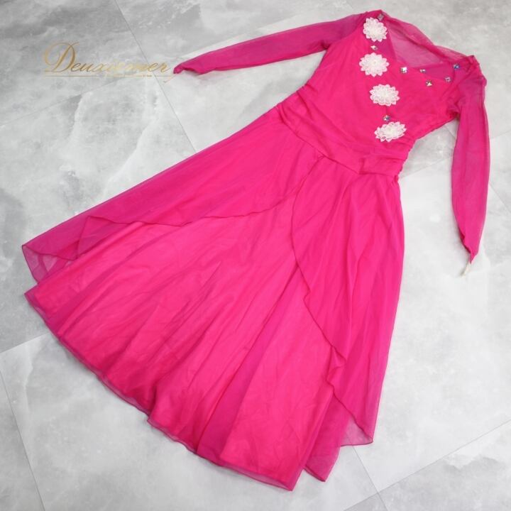 社交ダンス 衣装 スタンダード ドレス ワンピース ステージ衣装 パーティドレス レディース マゼンダピンク系 ビジュー レース 長袖 派手 マゼンダ パーティー フォーマル 結婚式 発表会 おしゃれ 女性用 高級感 きれいめ かわいい 華やか シンプル 大人っぽい シルエット 着やすい 選べるサイズ 薄手 伸縮性あり 透け感