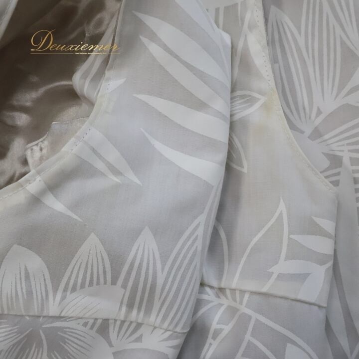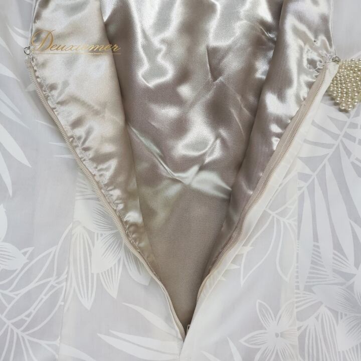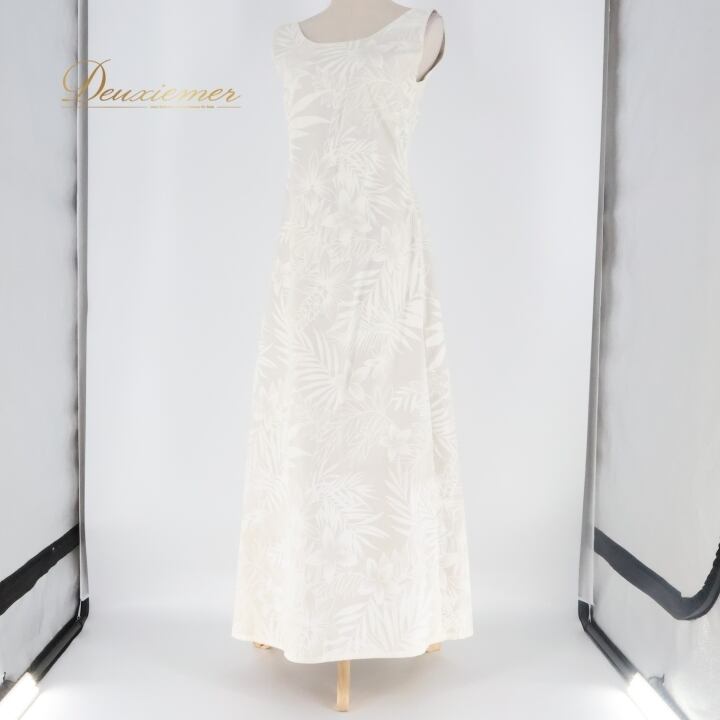 フラダンス 衣装 ワンピース ドレス ホワイト系 ワンカラー ノースリーブ パール リボン プルメリア柄 シンプル かわいい 華やか 上品 高級感 明るい 白 ハワイアン アロハ ハワイアンプリント フラ ダンス レッスン 練習 おしゃれ