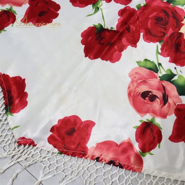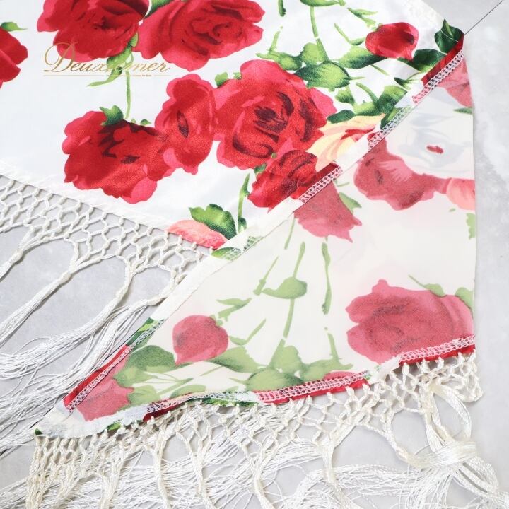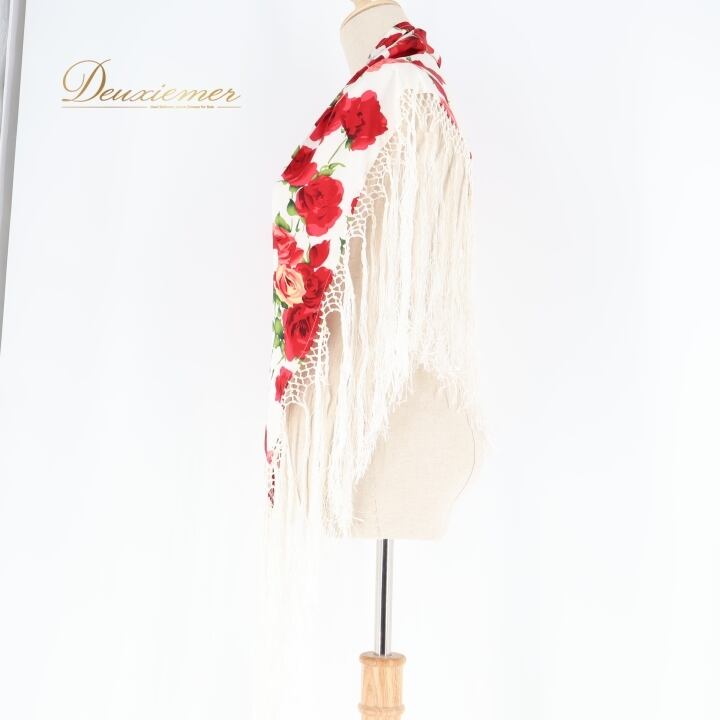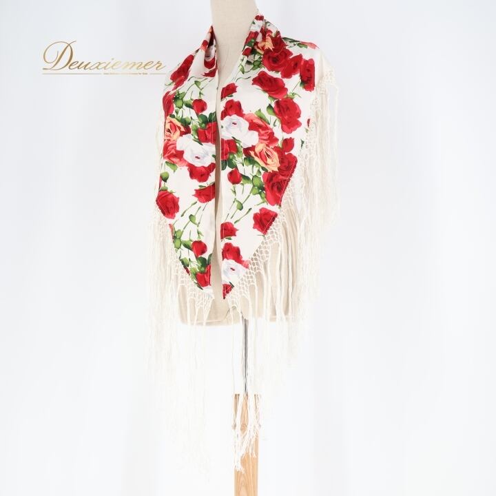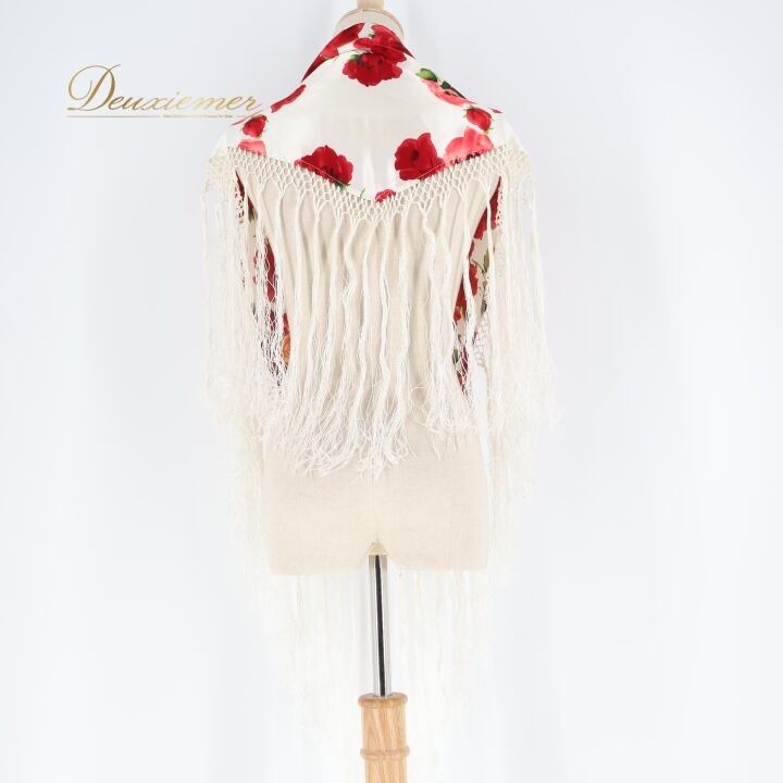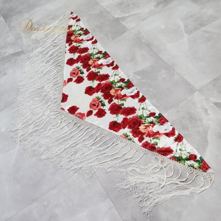 フラメンコ 衣装 シージョ フレコ ピキージョ 花柄 フリンジ 赤 白 小物 飾り 装飾 トライアングル 三角形 ホワイト系 レッド系 軽い素材 おしゃれ フラメンコ衣装 舞台衣装 イベント用 かわいいデザイン 薔薇柄 大人用 女性用 花柄アクセサリー フリンジ付き 柄物シージョ トライアングル型 赤白