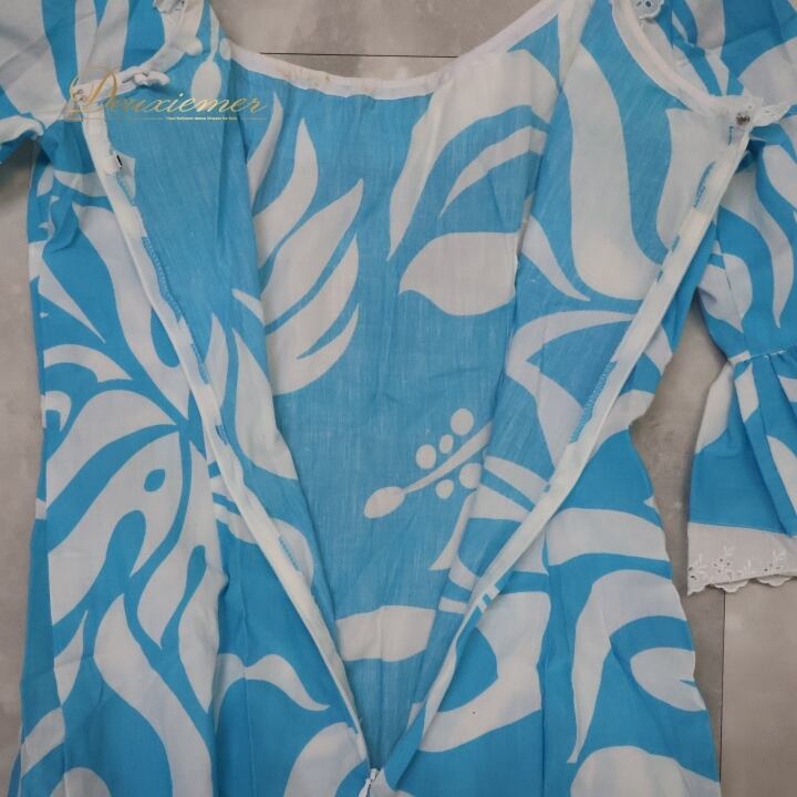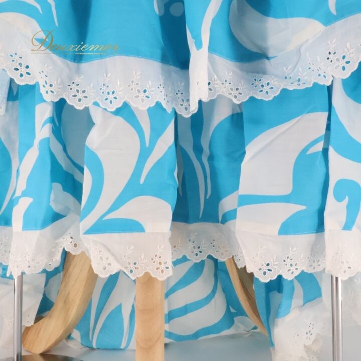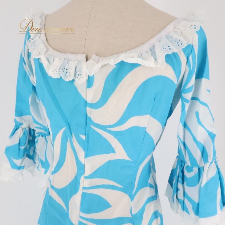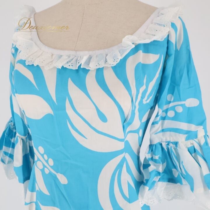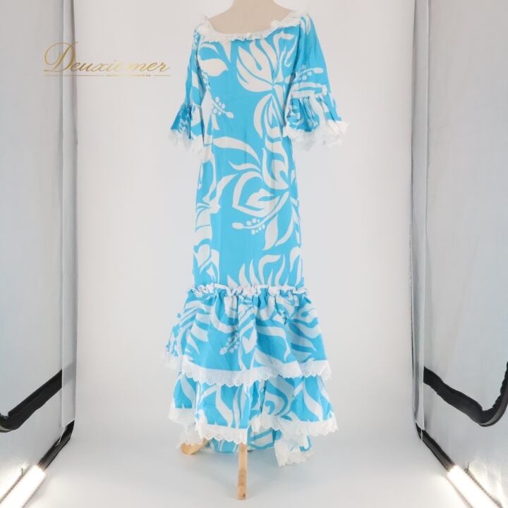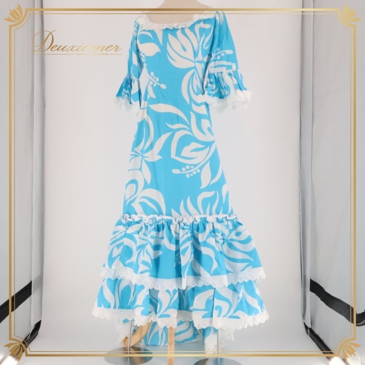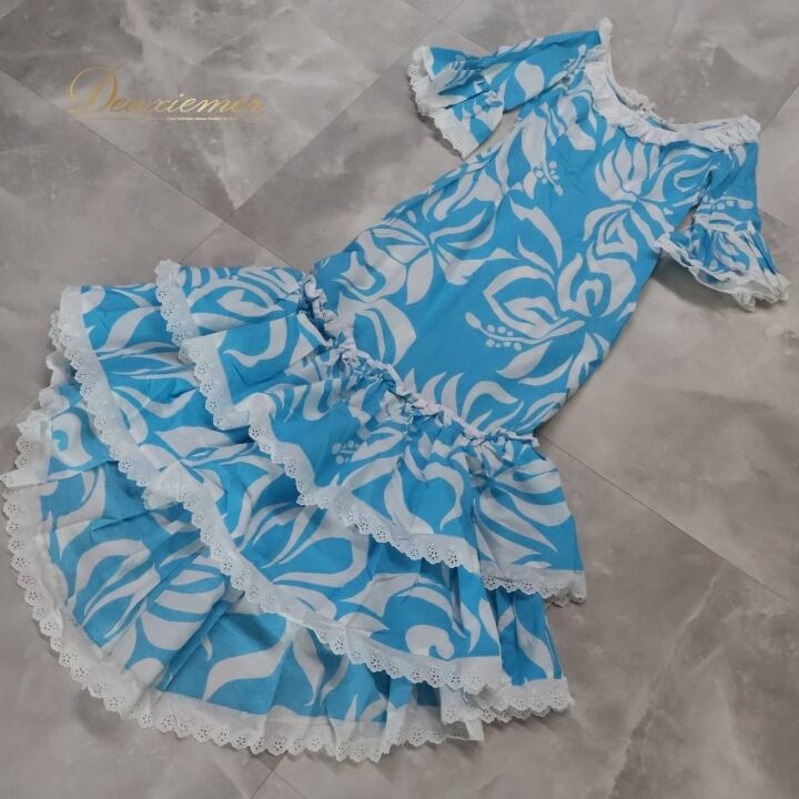 フラダンス 衣装 ワンピース ドレス タリーズポリネシア ブルー系 TALI’S POLYNESIA ハワイ製 アシンメトリー フリル かわいい 華やか 鮮やか 明るい ゴージャス 水色 白 ハワイアン アロハ ハワイアンプリント フラ ダンス レッスン 練習