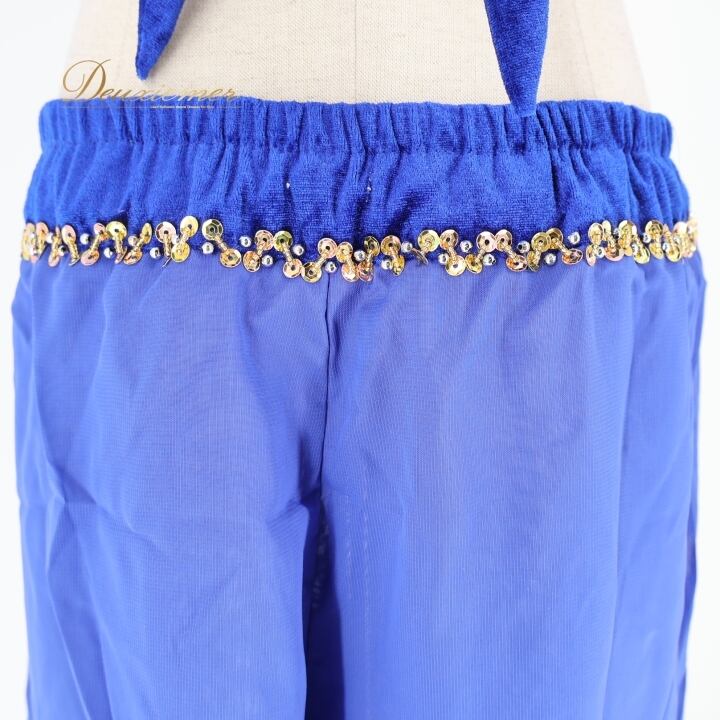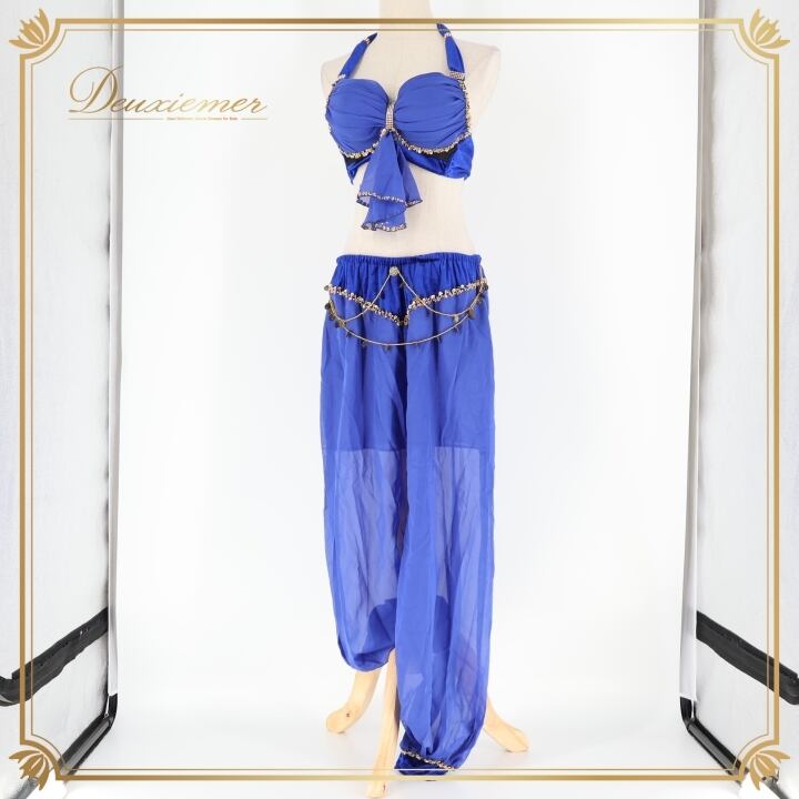 ベリーダンス 衣装 上下セット ブルー系 トップス ズボン フェイスベール ヘッドスカーフ アーム アーム飾り ハーレムパンツ パンツ 青 金 アラジン コスプレ 華やか 練習 レッスン スパンコール ラインストーン コイン キラキラ 鮮やか ゴールド系