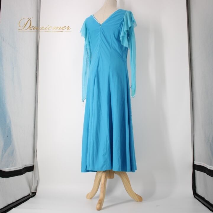 社交ダンス 衣装 スタンダード ドレス ワンピース パーティドレス 水色 ライトブルー系 ラインストーン レース 長袖 華やか 派手 デモ 上品 ライトブルー 発表 会 衣装 おしゃれ 春 夏 快適 フェミニン 大人 かわいい エレガント フェスティバル パーティーイベント デザイン シンプル 通気性 高級感 刺繡 ディテール