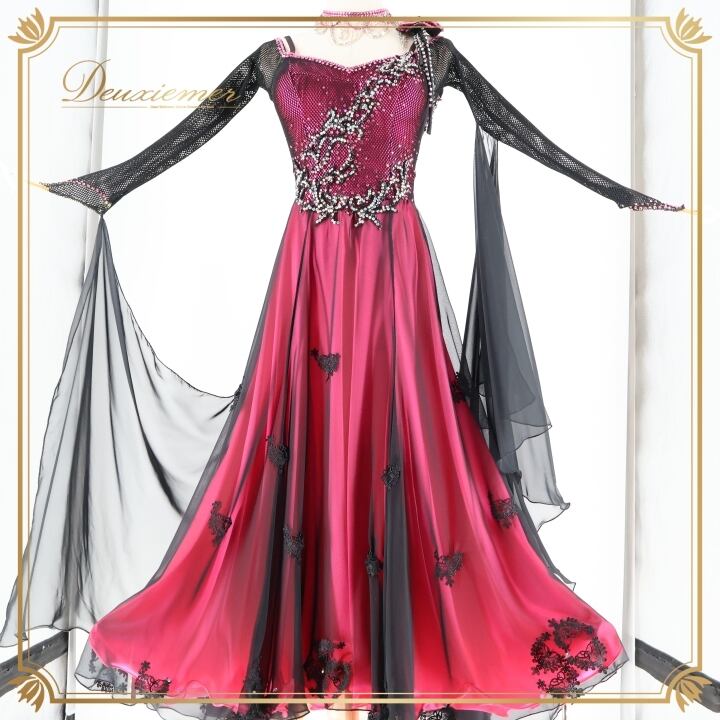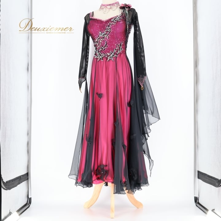 社交ダンス 衣装 タカダンス TAKADANCE スタンダードドレス ドレス ワンピース スタンダード フロート レース 花 デモ 競技 かわいい 光沢 高級感 メッシュ 発表会 パーティ ピンク 黒 ブラック系 ピンク系 ふんわり スカート レディース Mサイズ おしゃれ ダンス衣装 競技用 イベント用 ステージ衣装