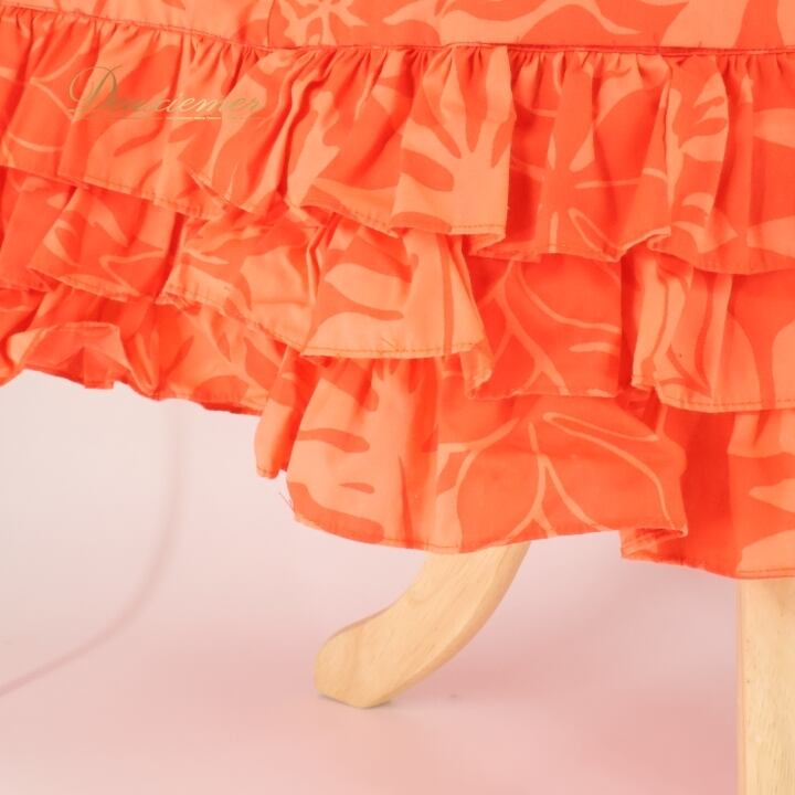フラダンス 衣装 ワンピース ドレス オレンジ系 CC Fashions ハワイ製 ティアレ柄 ハワイアンプリント アロハ フラ ダンス レッスン 練習 花柄 植物柄 フリル 華やか 鮮やか かわいい おしゃれ 上品 フラワープリント お出かけ 楽しい 夏オシャレ 女性用 ドレッシー リゾート トロピカル ラブリー ドレスアップ
