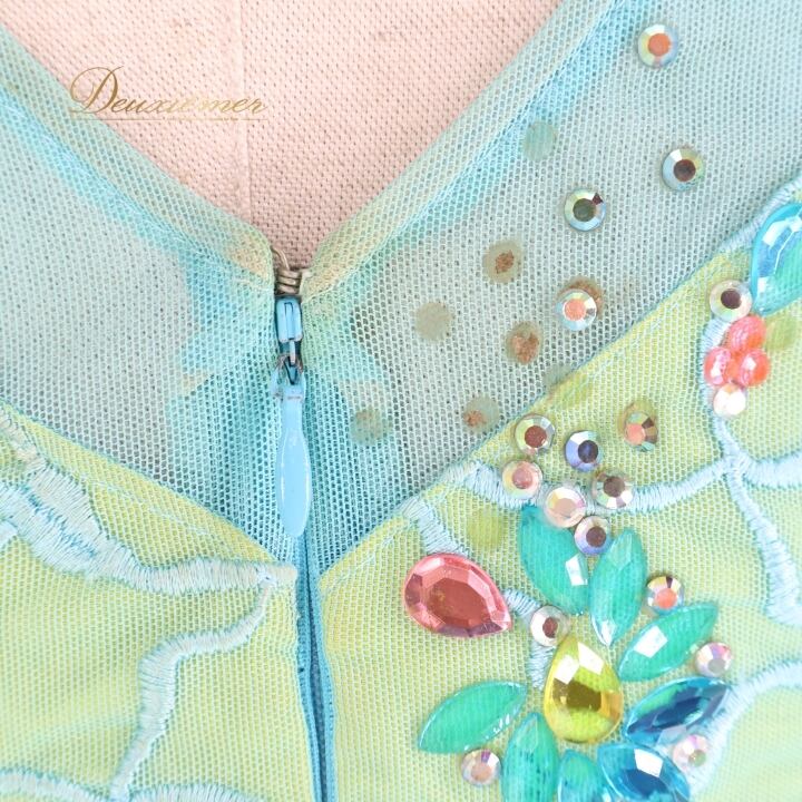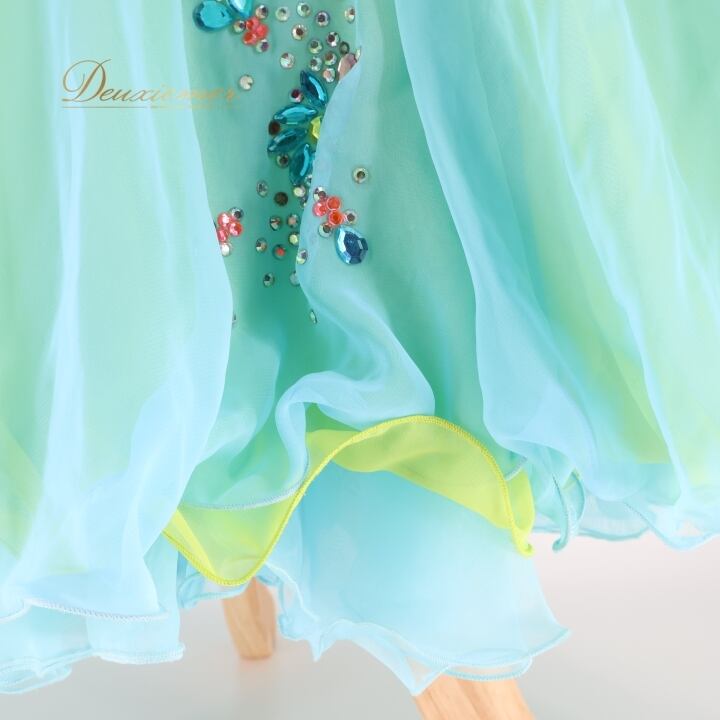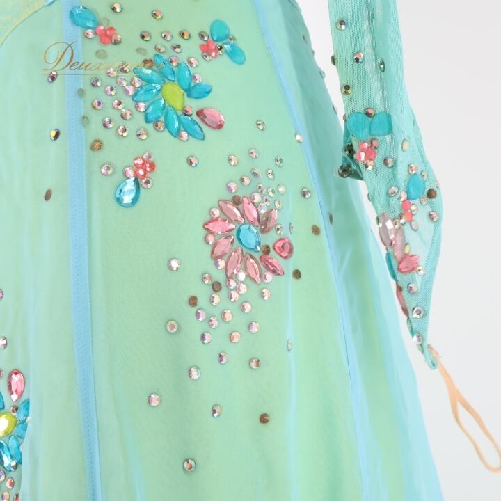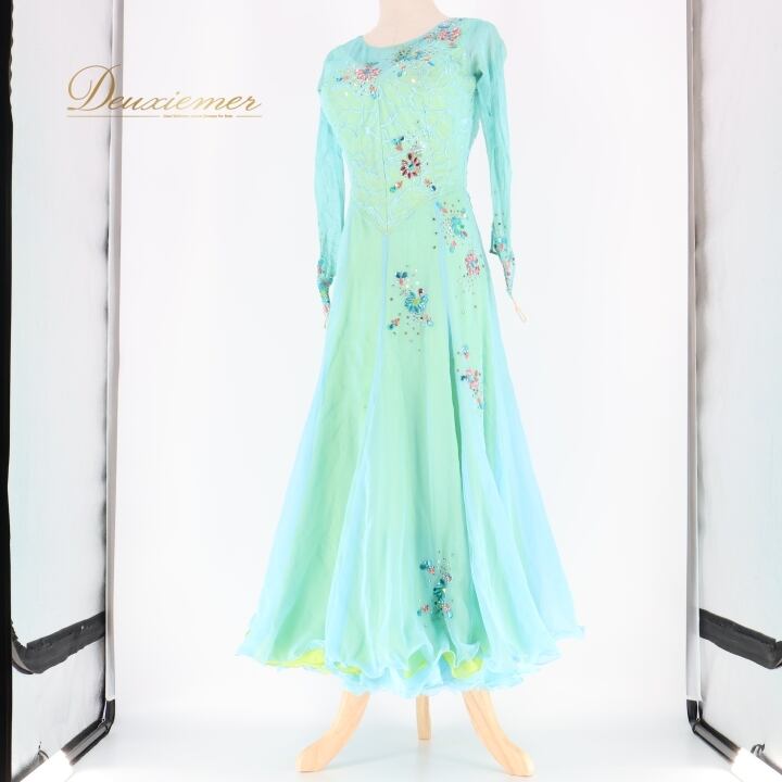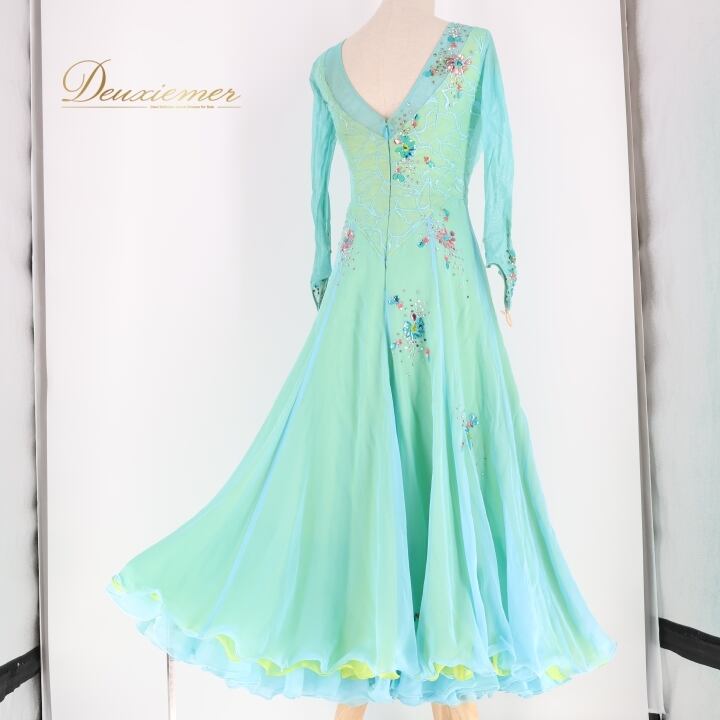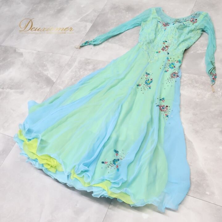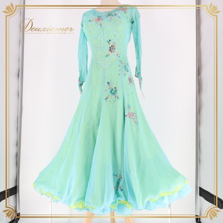 社交ダンス 衣装 スタンダードドレス ワンピース ドレス SORELI ソレリ 日本製 黄緑 緑 水色 ミント パーティ 発表会 デモ 競技 フリル 明るい グリーン系 ブルー系 社交ダンス ドレス おしゃれ 高級感 着やすい 女性用 フリルデザイン ステージ衣装 競技用ドレス 上品 パーティー衣装 フェミニン