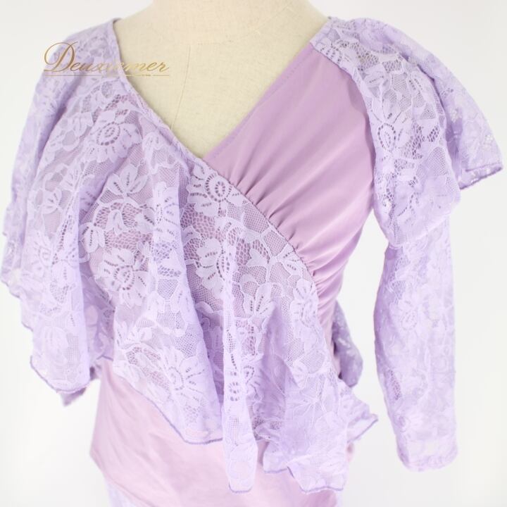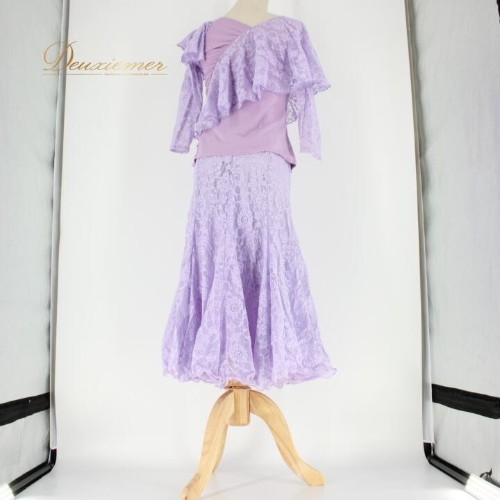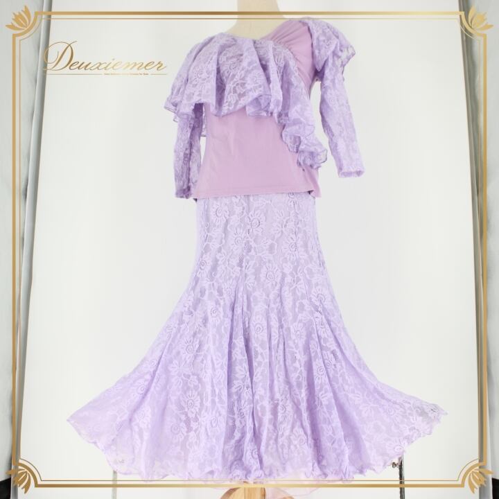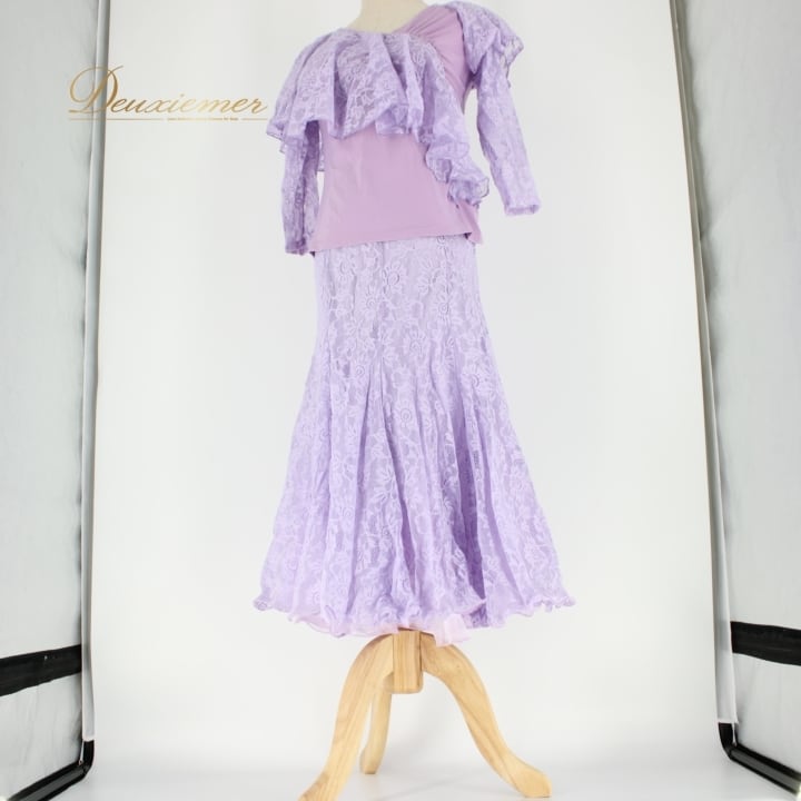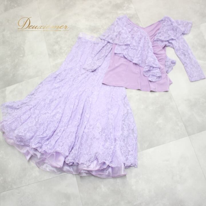 #社交ダンス #ダンス衣装 #セットアップ #ライラックパープル #花柄レース #ふんわりスカート #女性ファッション #ダンススタイル #ダンスコーデ #スカートスタイル #伸縮性 #ウエストゴム #トルソー #ダンスウェア #ダンスパフォーマンス #優雅なスタイル #ファッションアイテム #おしゃれ #可愛い #ENUTSU