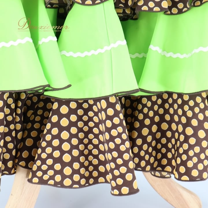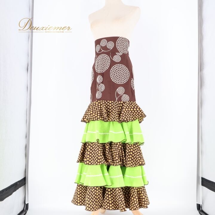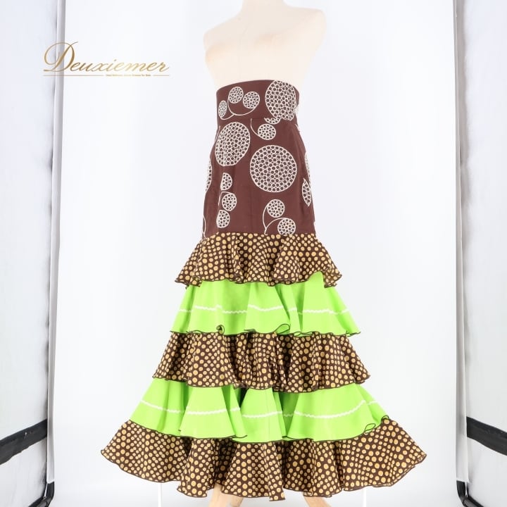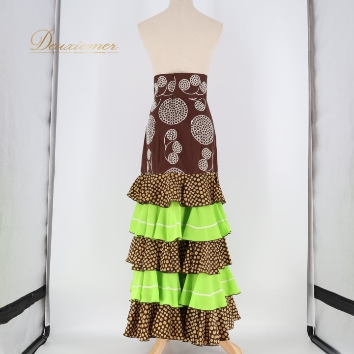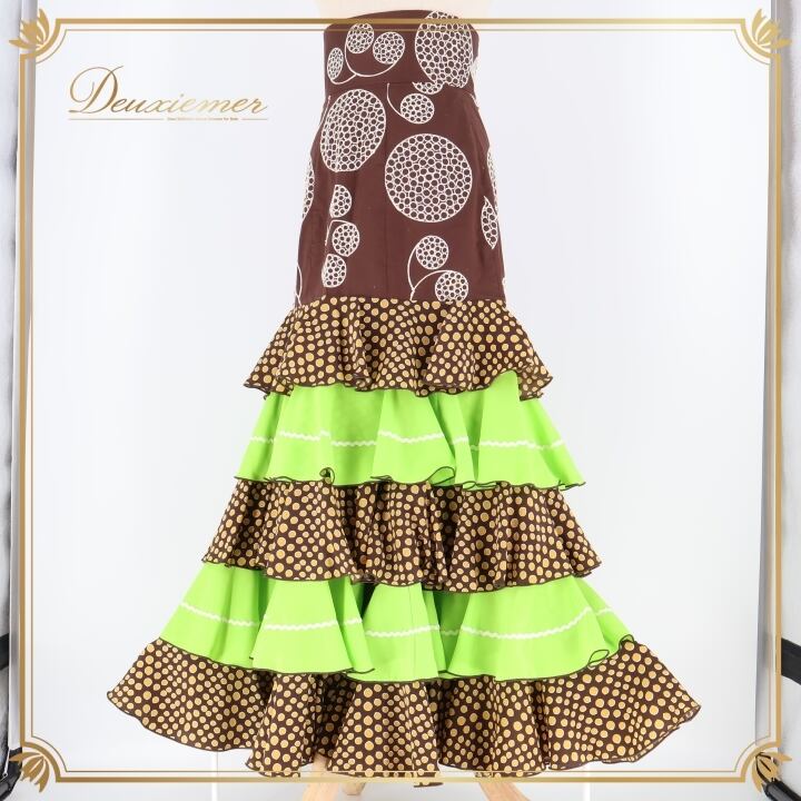 #フラメンコ #衣装 #ファルダ #スカート #ダンス衣装 #ハイウエスト #脚長効果 #濃い茶色 #黄緑 #SONIAJOHNSON #ソニアジョーンズ #トルソー #ダンスファッション #スペインダンス #フラメンコダンス #パーティー #カラフル #ファッション #コスチューム #ENUTSU