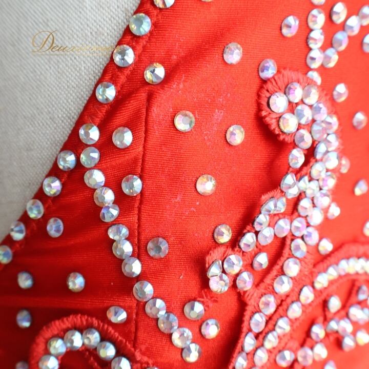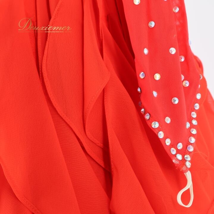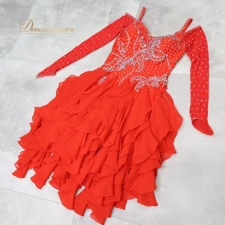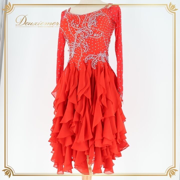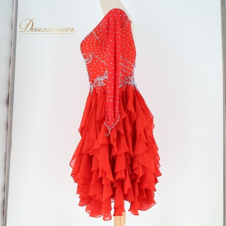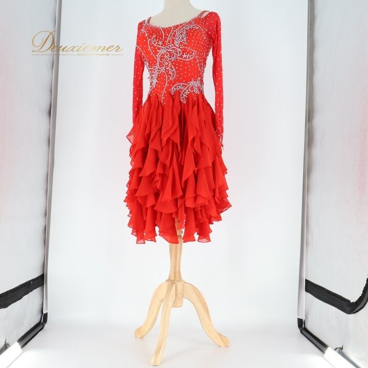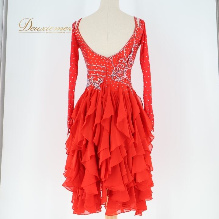 社交ダンス 衣装 ラテン ドレス ワンピース レース デモ 競技 ダンス パーティ 発表会 ストレッチ 赤 ビジュー レッド系 華やか フリル おしゃれ パーティードレス 発表会ドレス 女子ダンス フォーマル衣装 競技用ドレス ステージ衣装 豪華デザイン エレガント ドレスアップ ダンスパフォーマンス