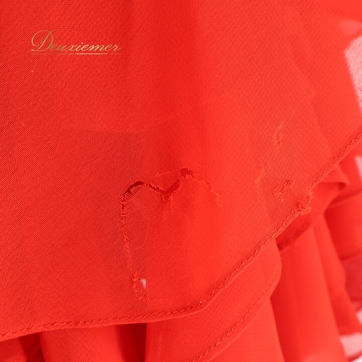 大きく目立つような傷は御座いませんが左側裾破れ箇所御座います。