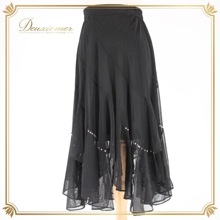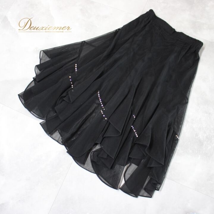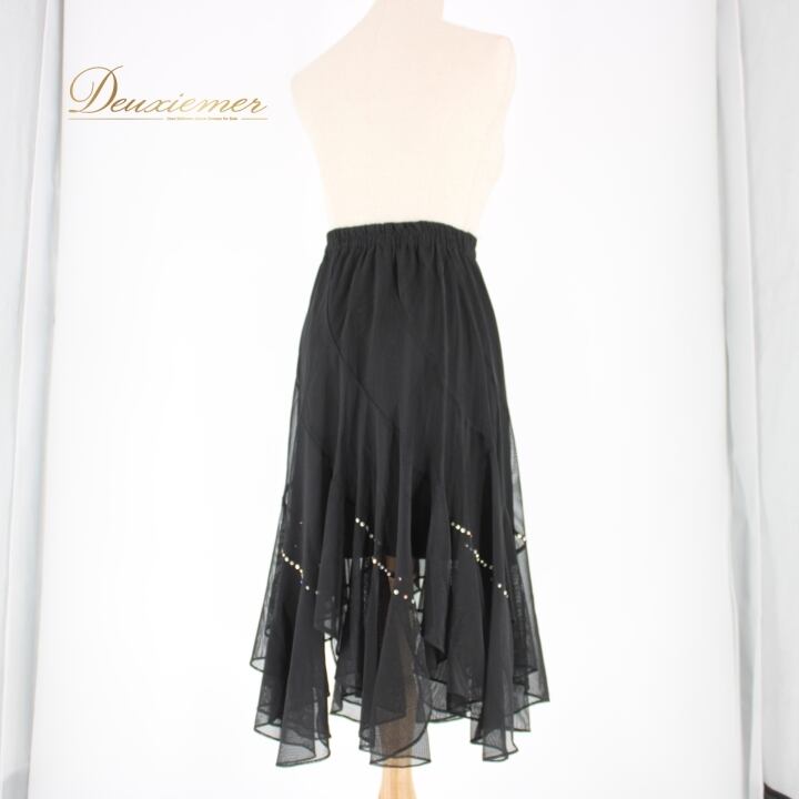社交ダンス 衣装 スタンダード スカート レッスンウェア レディース オールシーズン 無地 ブラック系 黒 ラインストーン レース フォーマル 上品 おしゃれ セットアップ パーティー ダンス教室 発表会 着丈 伸縮性 フェミニン 透け感 ゴムウエスト カジュアル
