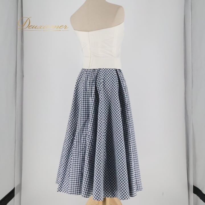 #フラダンス #衣装 #ツーピース #セットアップ #フラダンス衣装 #ダンス #衣装セット #チェック柄 #ホワイト #ブルー #おしゃれ #シンプルデザイン #かわいい #ファスナー #女性用 #トルソー #ダンスコスチューム #パフォーマンス #ステージ衣装 #ENUTSU