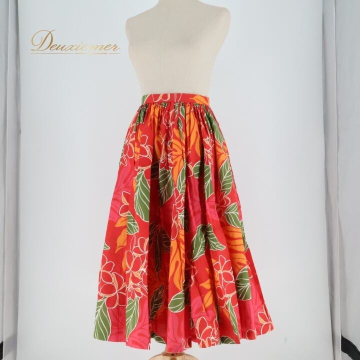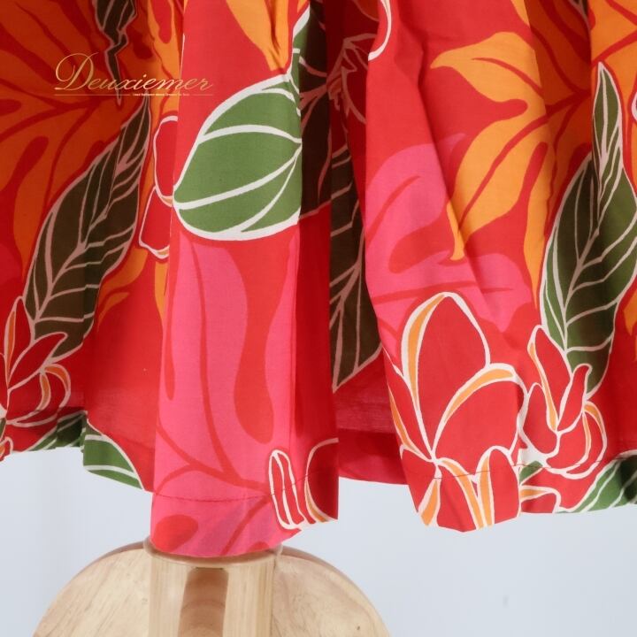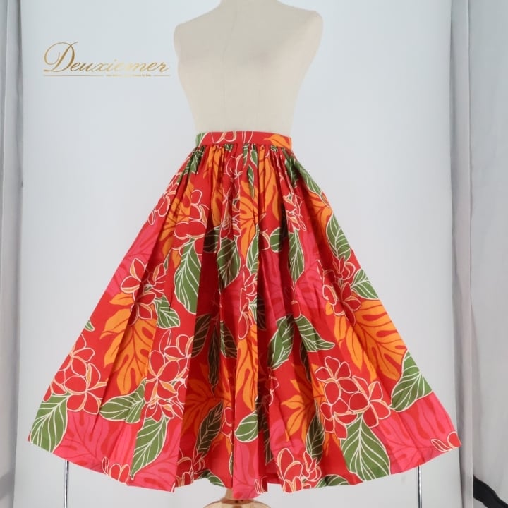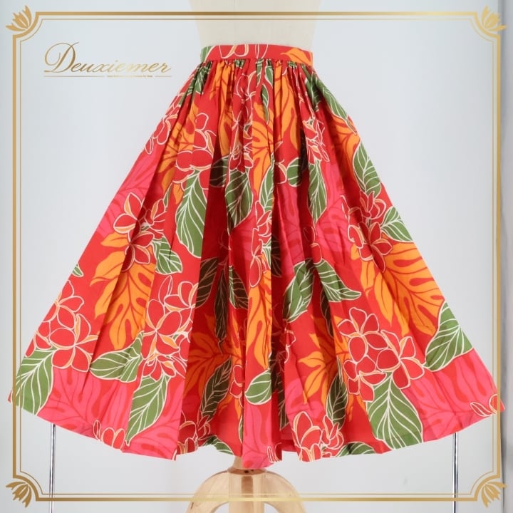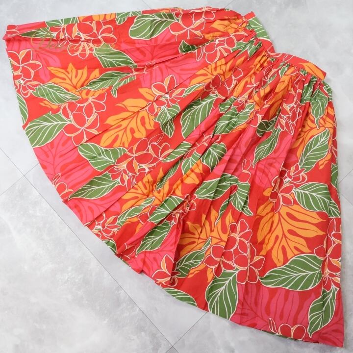 フラダンス 衣装 スカート レッド系 シングル プルメリア柄 ラウアエ柄 かわいい 華やか 鮮やか 明るい カラフル ふわふわ ひらひら 赤 橙 緑 ハワイアン アロハ ハワイアンプリント フラ ダンス レッスン 練習 オレンジ系 パーティー レディース