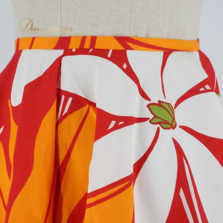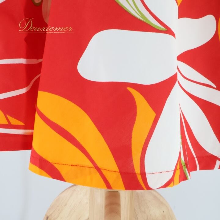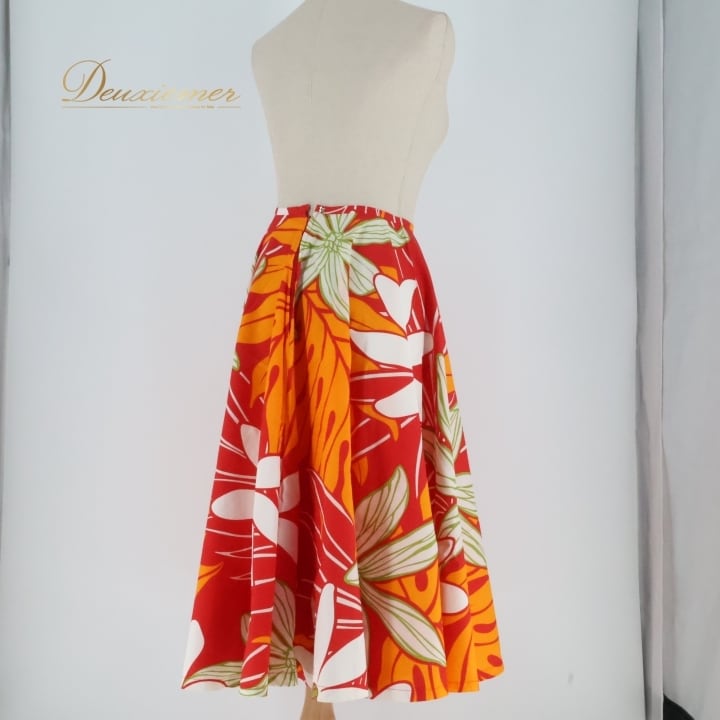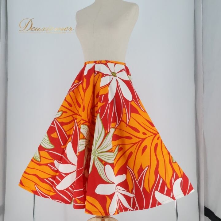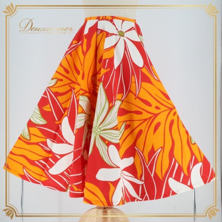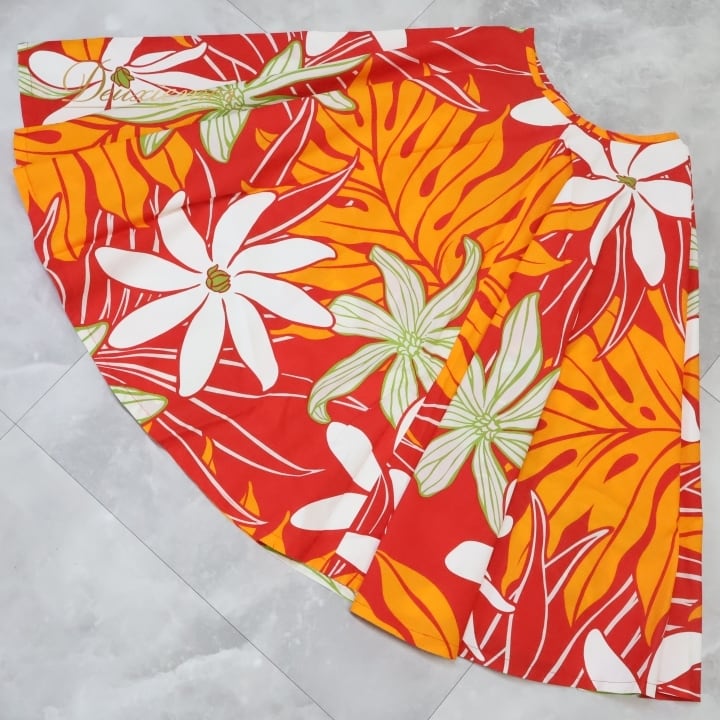フラダンス 衣装 スカート レッド系 オレンジ系 ティアレ柄 モンステラ柄 かわいい 鮮やか 華やか 明るい カラフル ひらひら ふわふわ 赤 橙 白 ハワイアン アロハ ハワイアンプリント フラ ダンス レッスン 練習 パーティー フェスティバル さらさら