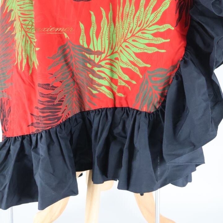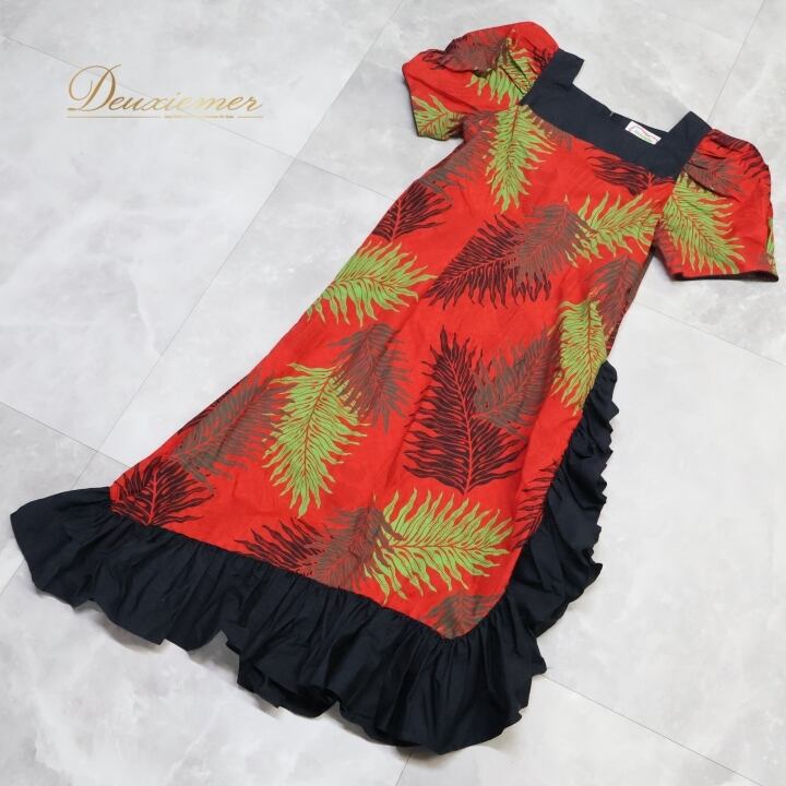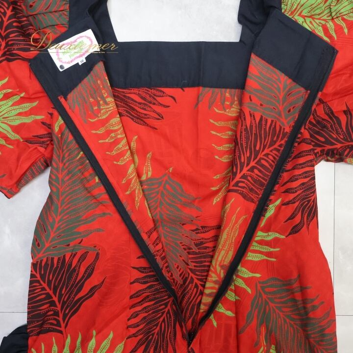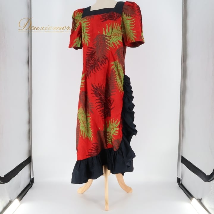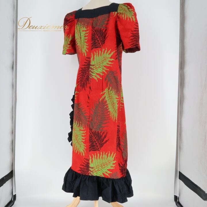フラダンス 衣装 ワンピース ドレス メネフネプランテーション レッド系 MENEHUNE PLANTETION フリル スリット パフスリーブ かわいい 華やか 鮮やか 明るい 赤 黒 ハワイアン アロハ ハワイアンプリント フラ ダンス レッスン 練習
