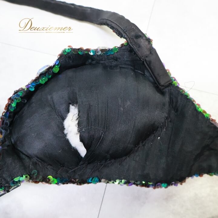 スパンコールが裏返っている部分広範囲に有り。表面に多数剥がれ有り。