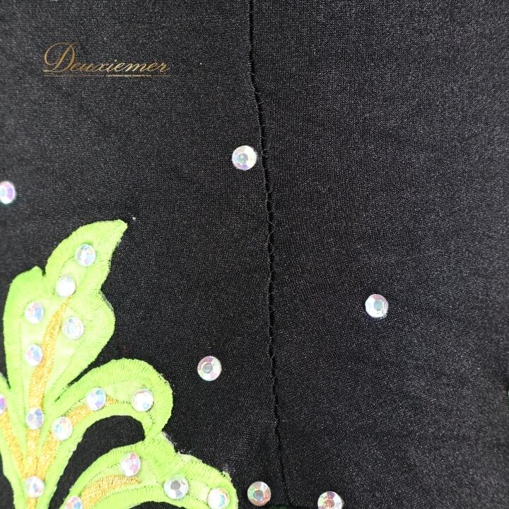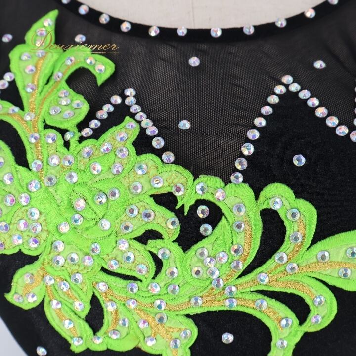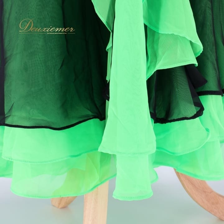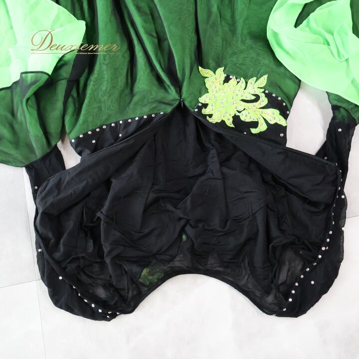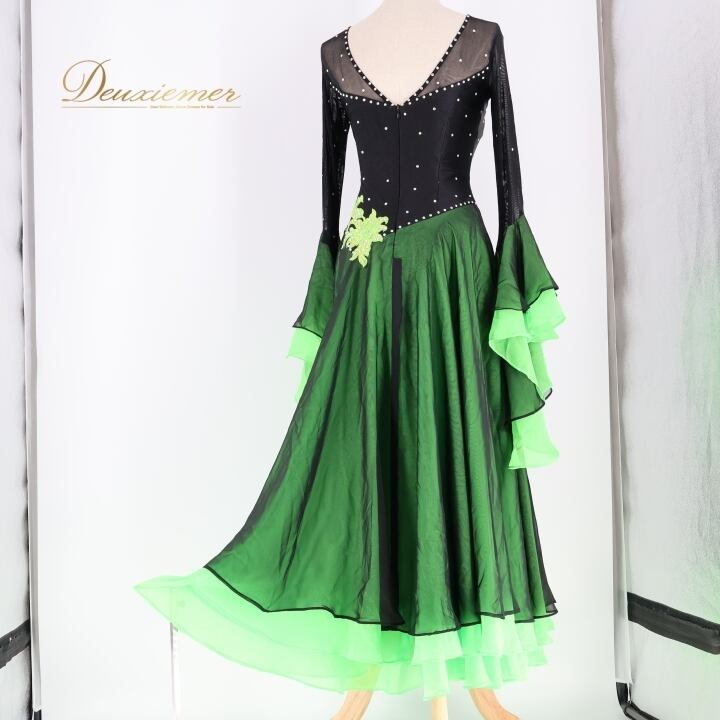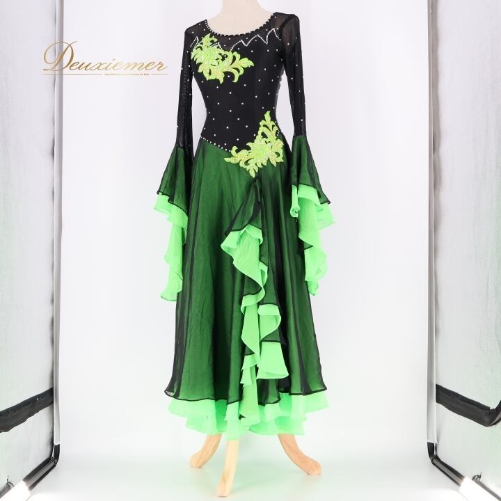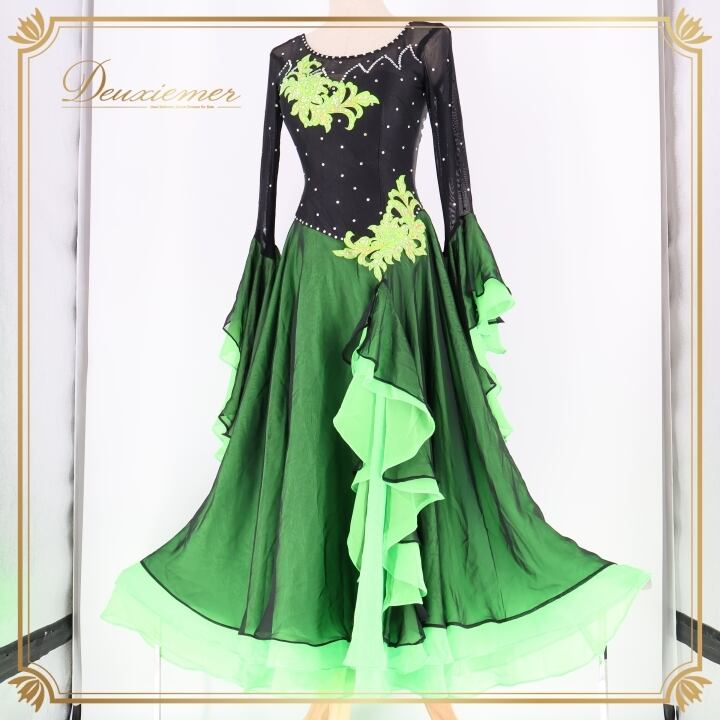 社交ダンス 衣装 スタンダードドレス ワンピース ドレス 黒 レース フリル デモ 競技 ダンス パーティ 発表会 緑 ブラック系 グリーン系 おしゃれ 大きな袖 上品 競技用 レオタード フォーマル 衣装