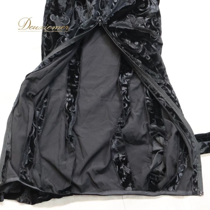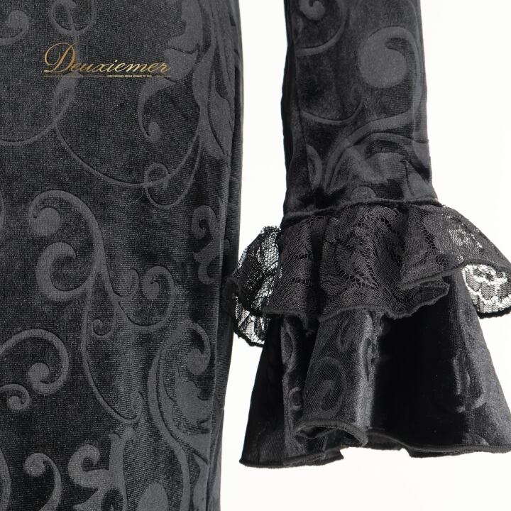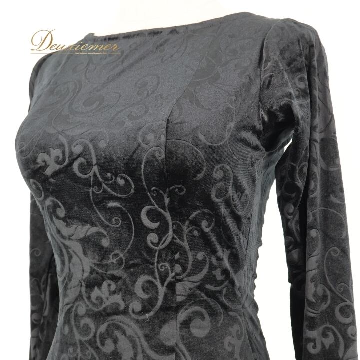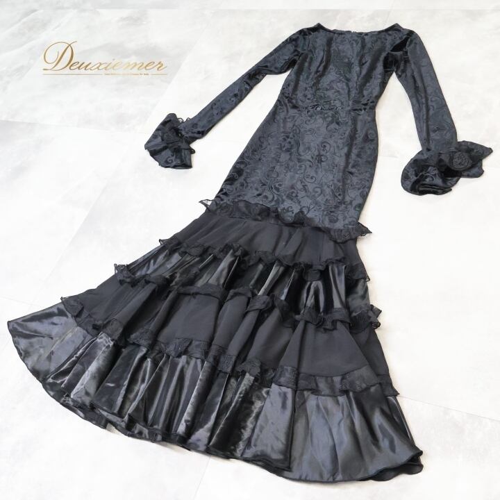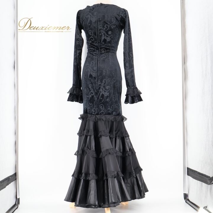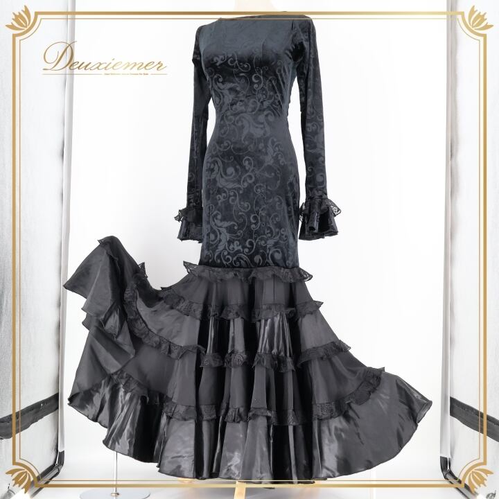 フラメンコ 衣装 ワンピース ドレス ベロア ベルベット 黒 高級感 長袖 フリル レース ダンス パーティ 発表会 上品 踊り スペイン ブラック系 スカート 光沢 エレガント 美しい ステージ衣装 おしゃれ ホール衣装 舞台衣装 派手 重ね着 華やか