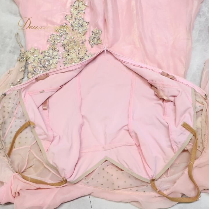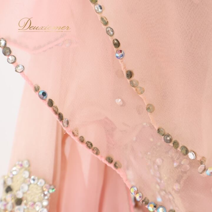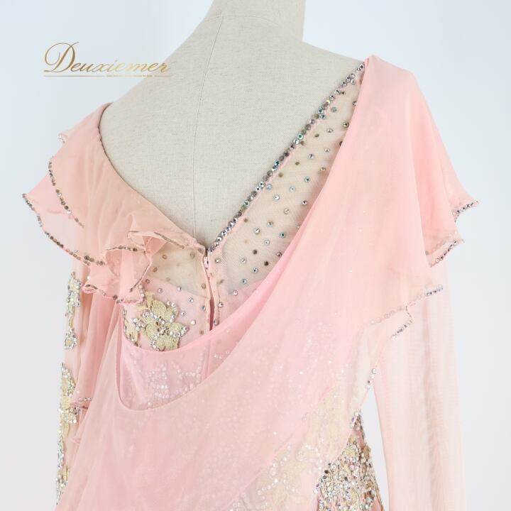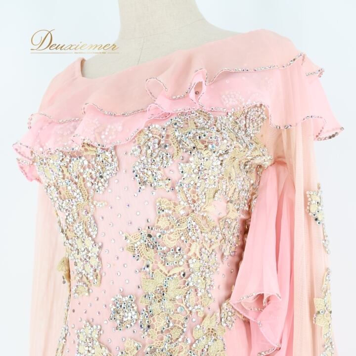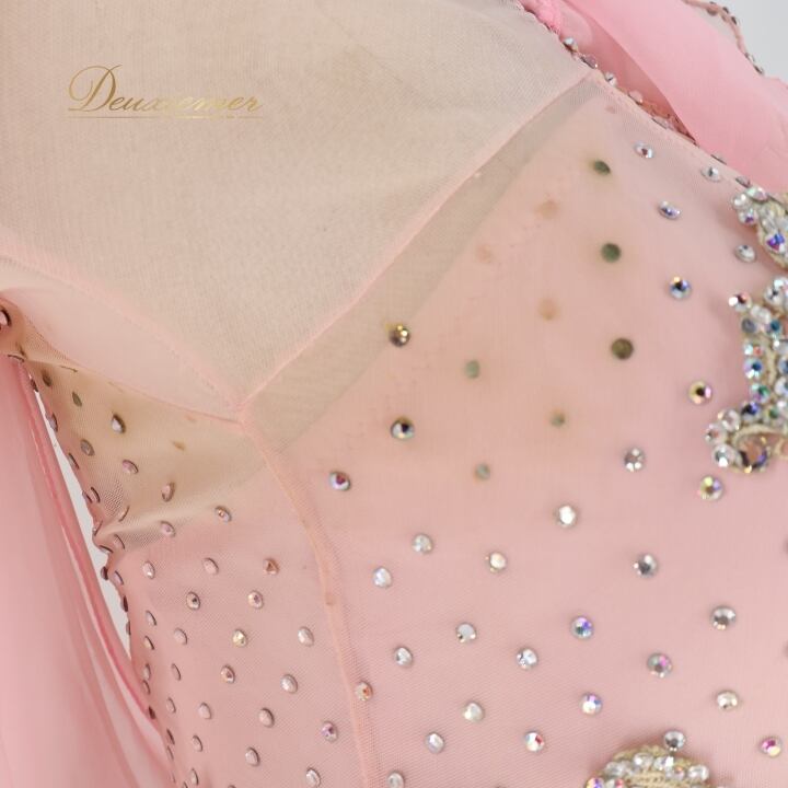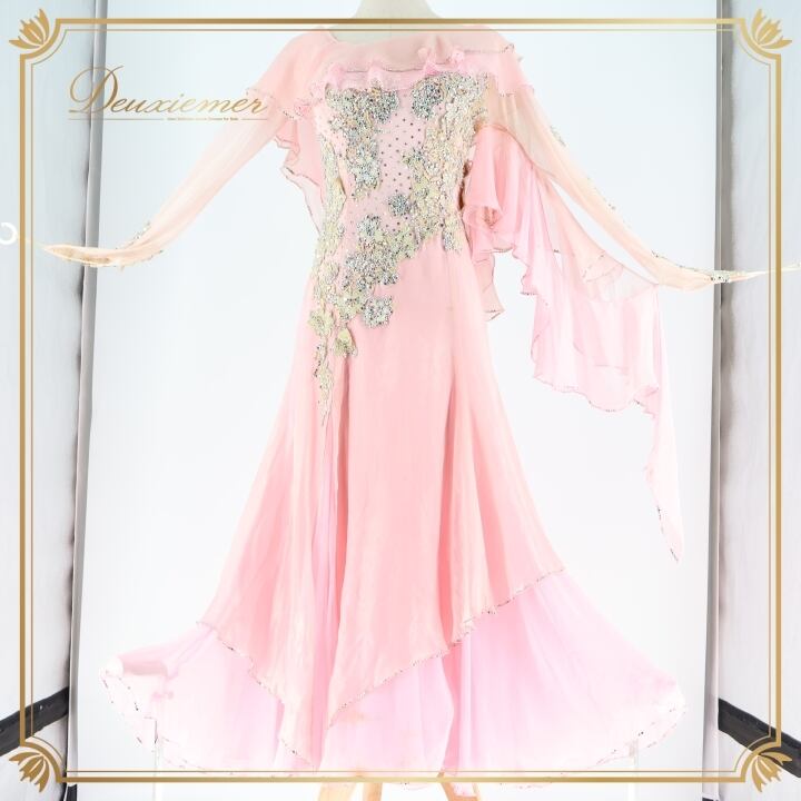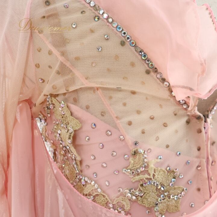 社交ダンス 衣装 スタンダードドレス ワンピース ドレス スタンダード ピンク フロート レース デモ 競技 ダンス パーティ 発表会 落ち感 綺麗 華やか 明るい ピンク系 柔らかい 素材 揺れる スカート シフォン 2枚重ね ふわふわ おしゃれ エレガント フェミニン フォーマル 上品 かわいい