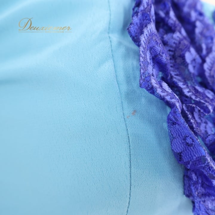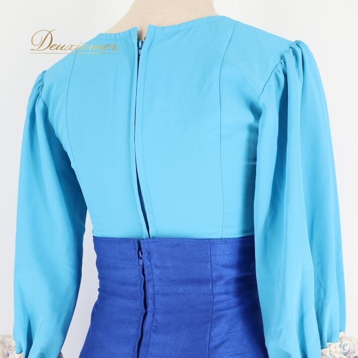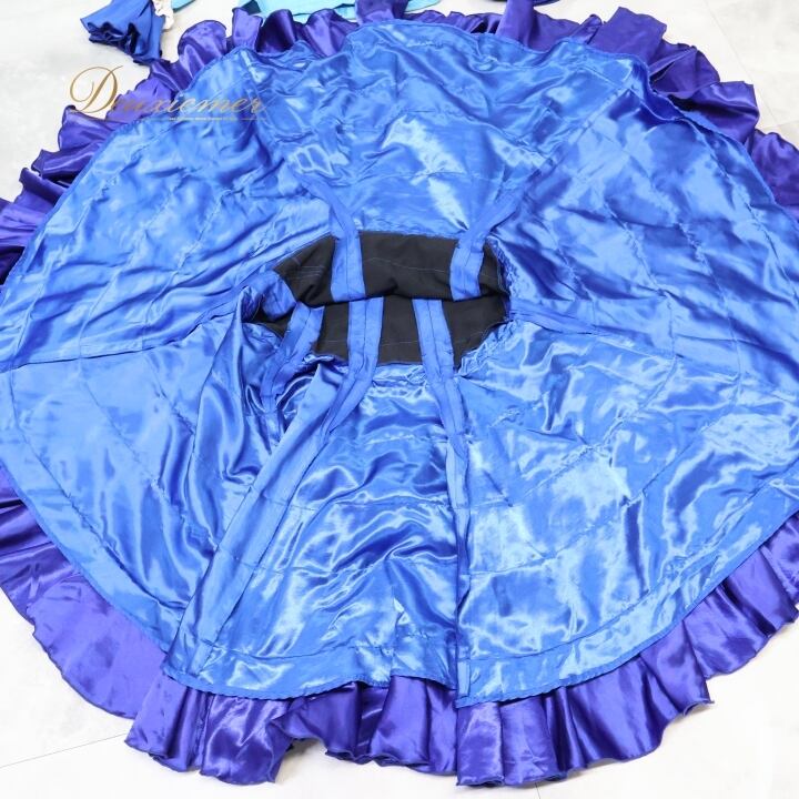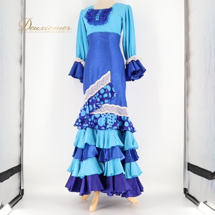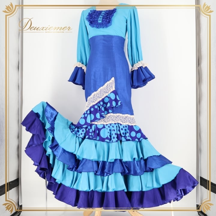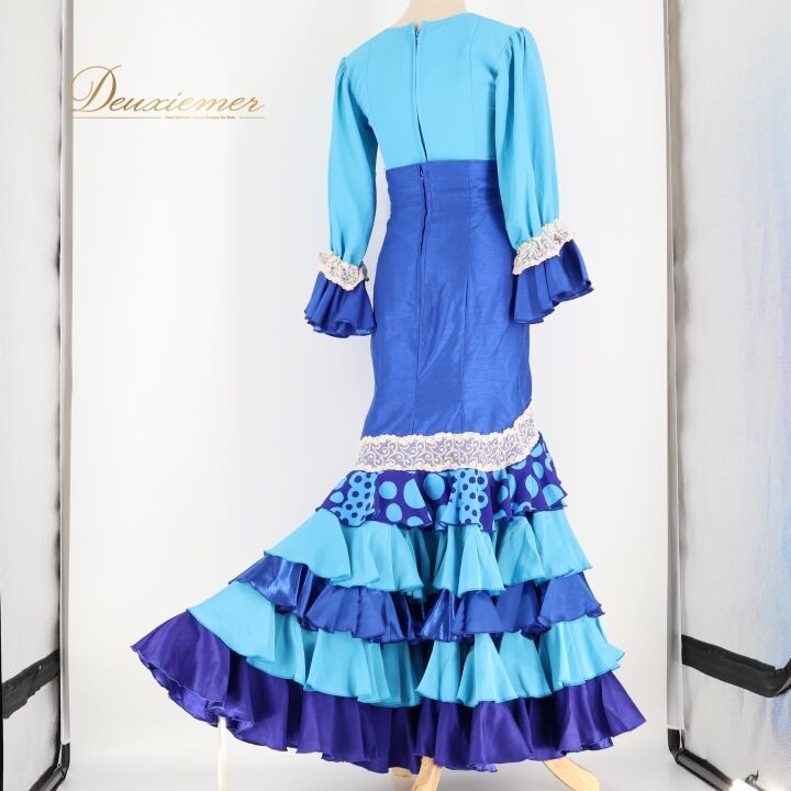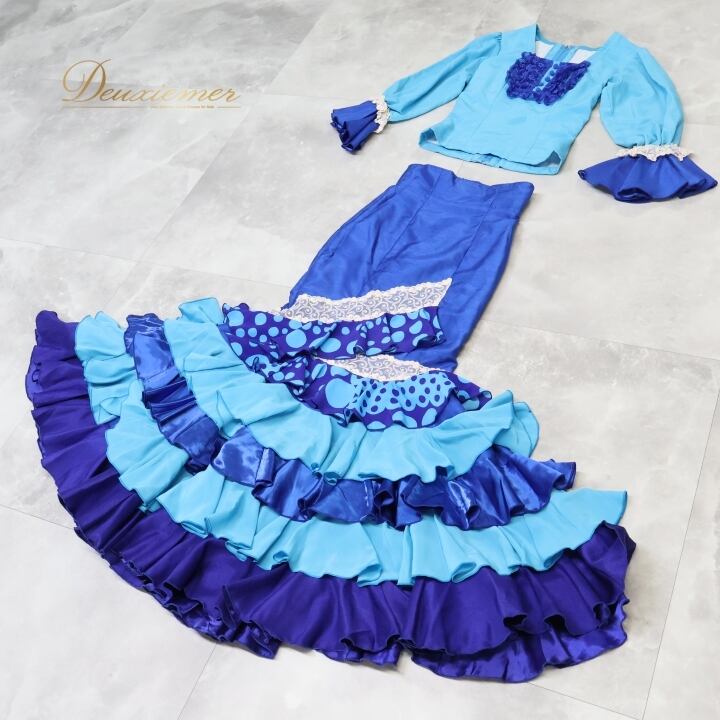 フラメンコ 衣装 トップス ファルダ ツーピース セットアップ 青 ボランテ フリル レース ハイウエスト 水色 長袖 舞台 柄 模様 水玉 ドット かわいい ブルー系 フラメンコ ダンス 衣装 パーティー コスチューム おしゃれ 可愛い ステージ衣装 ハイウエストスカート 美しい スカートシルエット