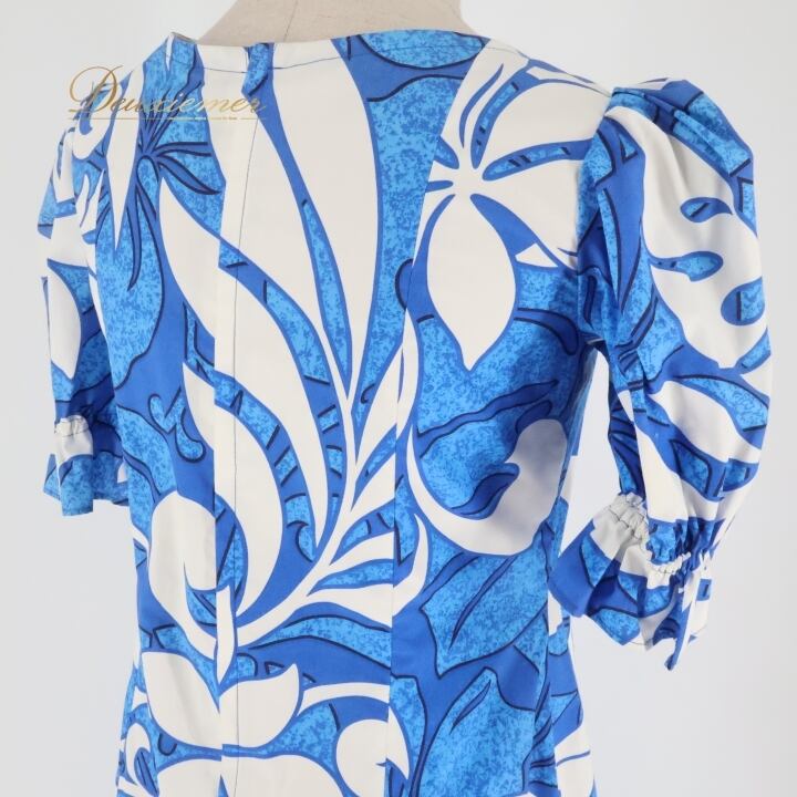 フラダンス 衣装 ワンピース ドレス ブルー系 フリル スリット アシンメトリー パフスリーブ ティアレ柄 かわいい 華やか 鮮やか 明るい 爽やか 青 白 ハワイアン アロハ ハワイアンプリント フラ ダンス レッスン 練習 ホワイト系 おしゃれ レディース