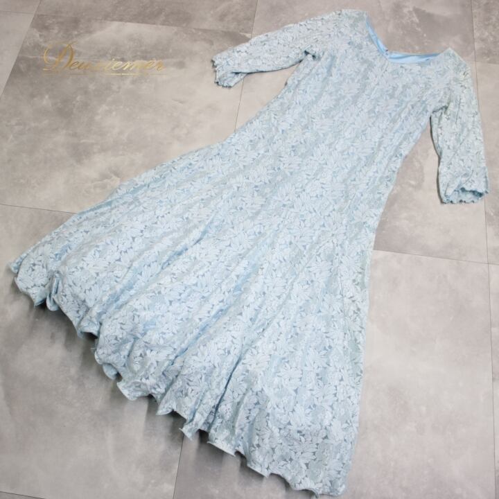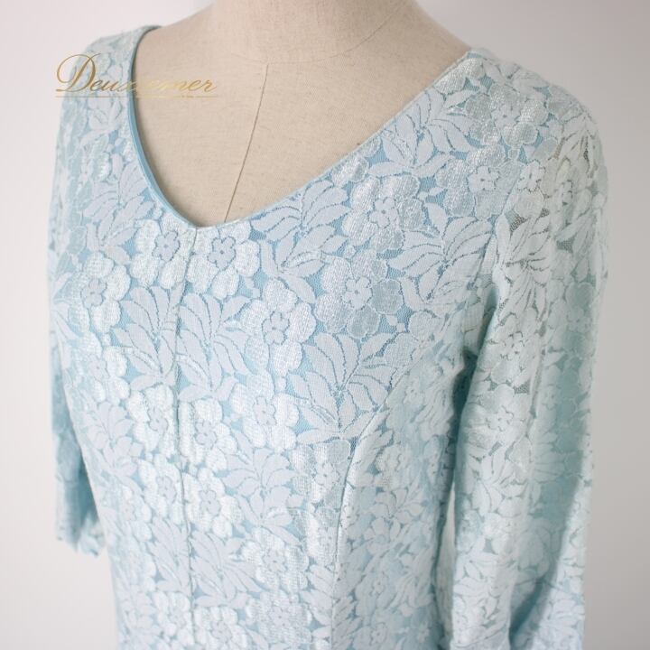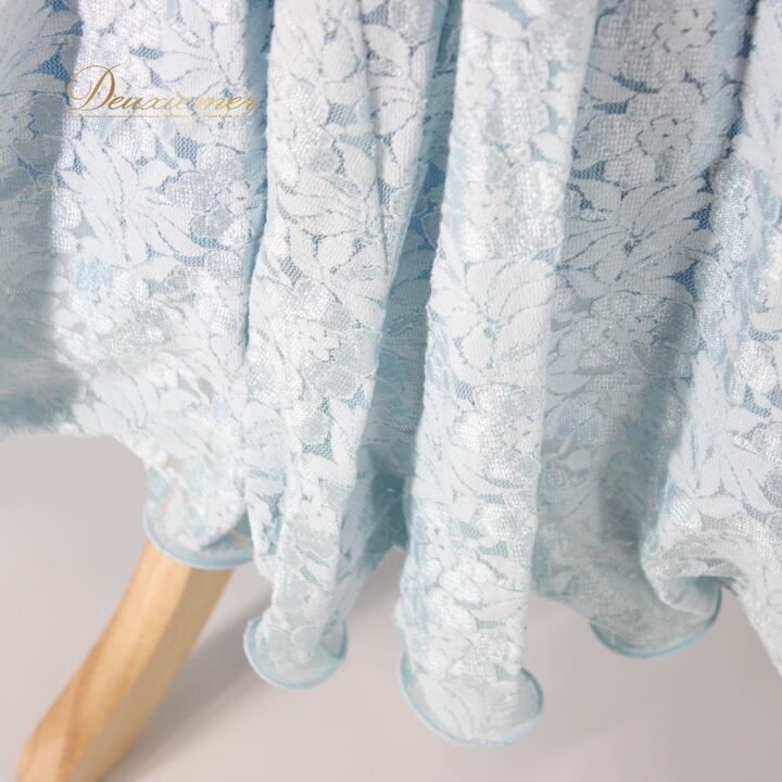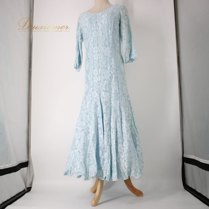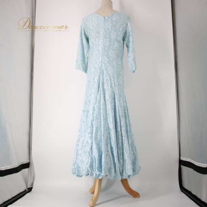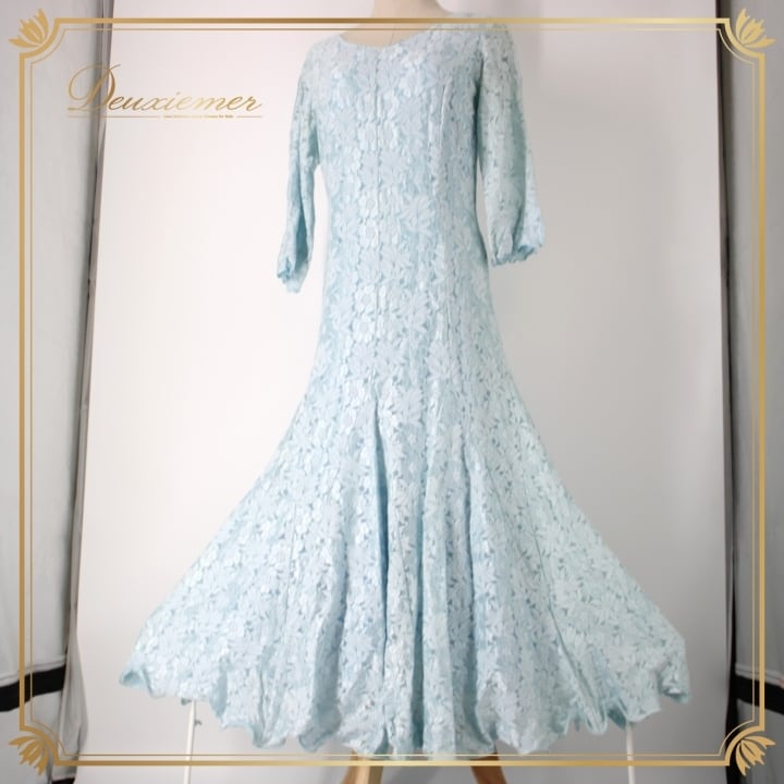 #社交ダンス #ダンス衣装 #ドレス #ライトブルー #花柄 #レース #優雅 #二重スカート #ファッション #ポリエステル #ナイロン #ポリウレタン #伸縮性 #トルソー #ダンスパフォーマンス #シックな印象 #女性用ドレス #おしゃれ #特別な日 #ENUTSU