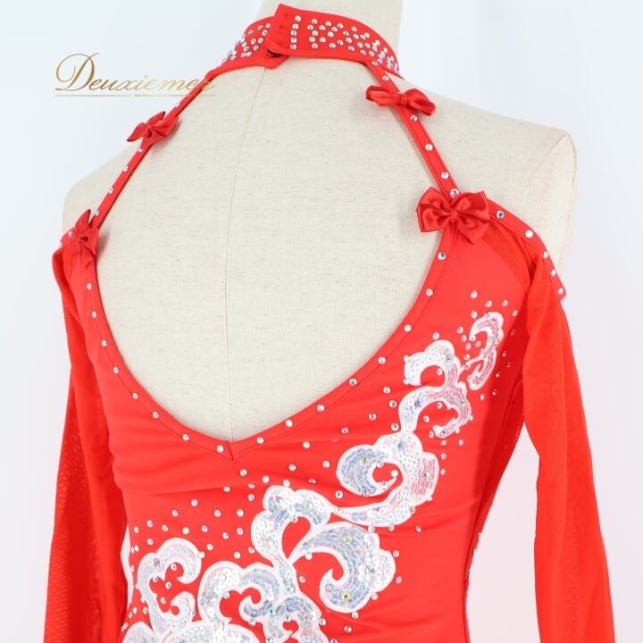 社交ダンス 衣装 ラテン ドレス ワンピース 赤 フリル デモ 競技 ダンス パーティ 発表会 パーティドレス 長袖 リボン かわいい レッド系 スパンコール ドレススタイル ラテンスタイル おしゃれ ダンスウェア パーティー用 キュート コスチューム フォーマル ドレッシー レディース
