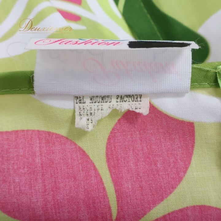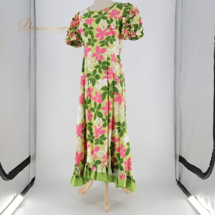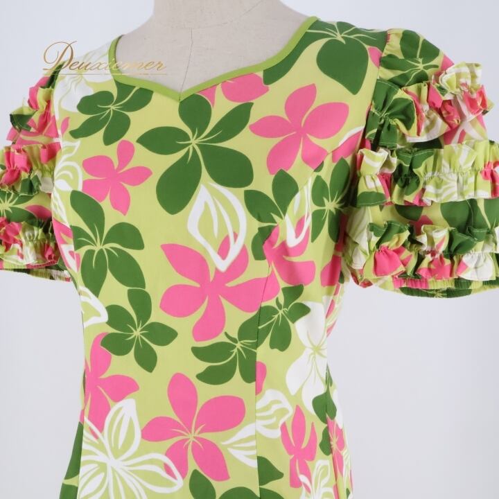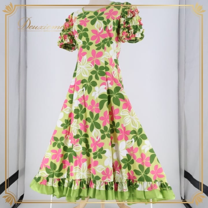 フラダンス 衣装 ワンピース ドレス ムームーファクトリー グリーン系 T&L MUUMUU FACTORY フリル パフスリーブ プルメリア柄 かわいい 華やか 鮮やか 明るい 緑 白 ピンク ハワイアン アロハ ハワイアンプリント フラ ダンス レッスン
