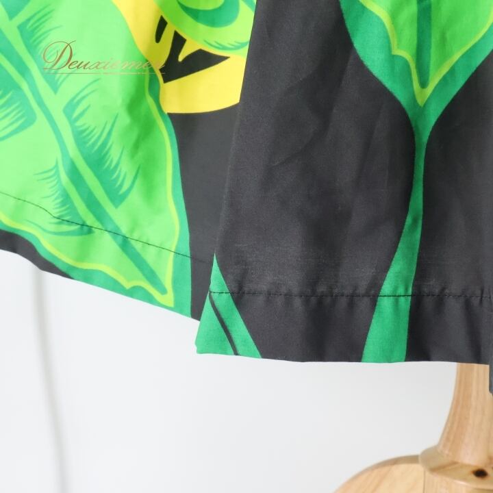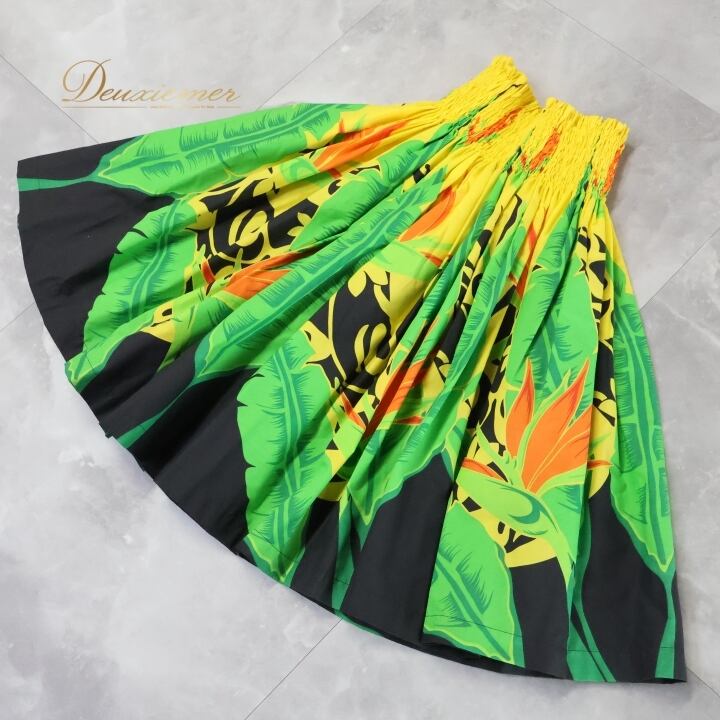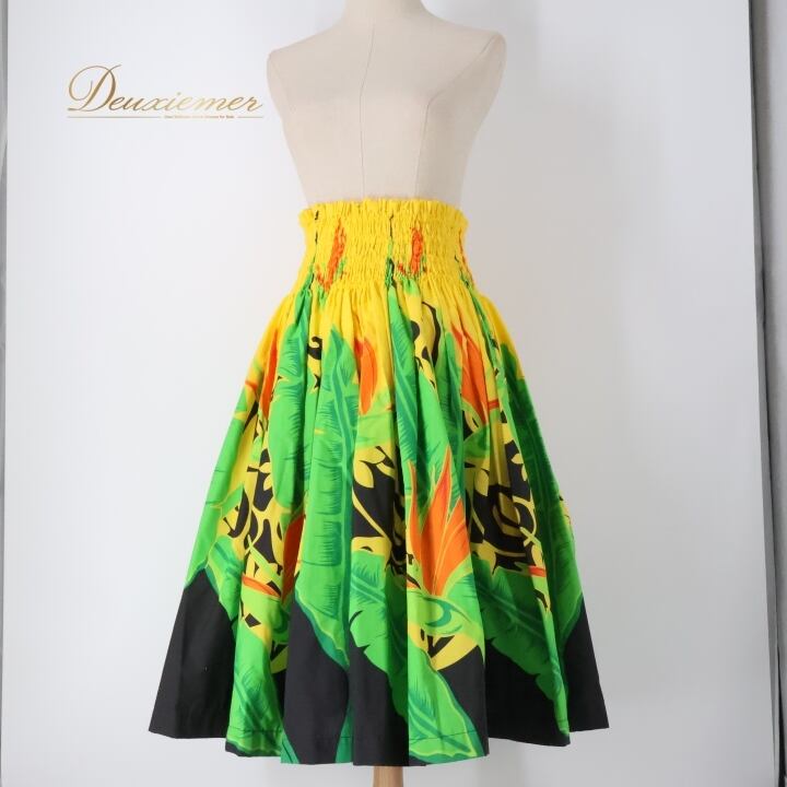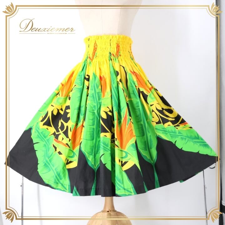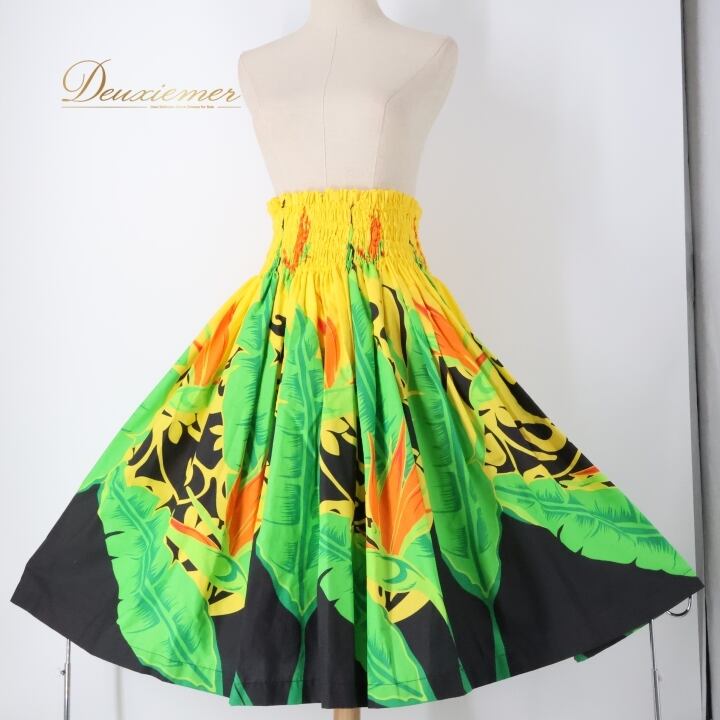 フラダンス 衣装 パウスカート イエロー系 アロハエミカ ハワイアンプリント アロハ フラ ダンス Aloha Emika レッスン 練習 花柄 植物柄 華やか 鮮やか かわいい おしゃれ シングル スカート ブラック系 グリーン系 オレンジ系 黄 黒 緑 黄緑 橙 ビビッド フレア スカート エスニック ハワイ かわいい